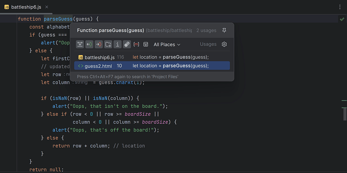 WebStorm 可以快速导航到符号声明,并向您显示其在整个项目中的用法。 只需将文本光标置于变量、字段、方法或其他符号处,然后按 Ctrl+B。