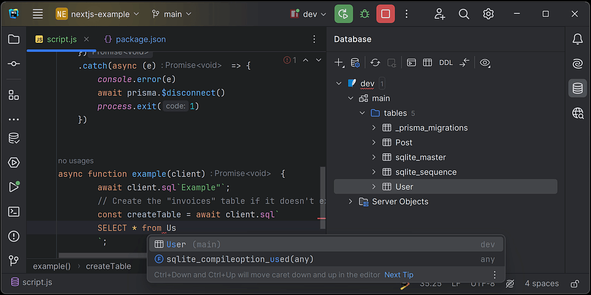 数据库工具和完整 SQL 支持与 WebStorm 捆绑在一起,无需额外付费。 您可以直接在 IDE 中查询、创建和管理数据库。 有关详情,请阅读这篇博文。