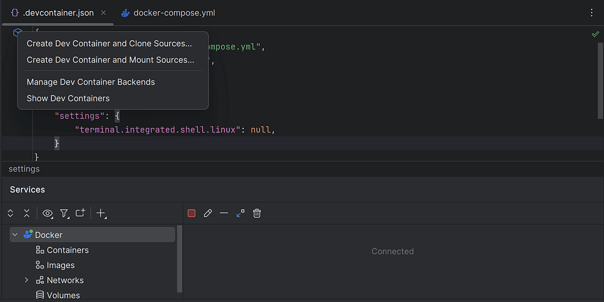 您可以在 Docker 容器中运行和调试应用程序,下载和构建镜像,使用 Docker Compose 运行多容器应用程序等,所有操作均在 IDE 中执行。