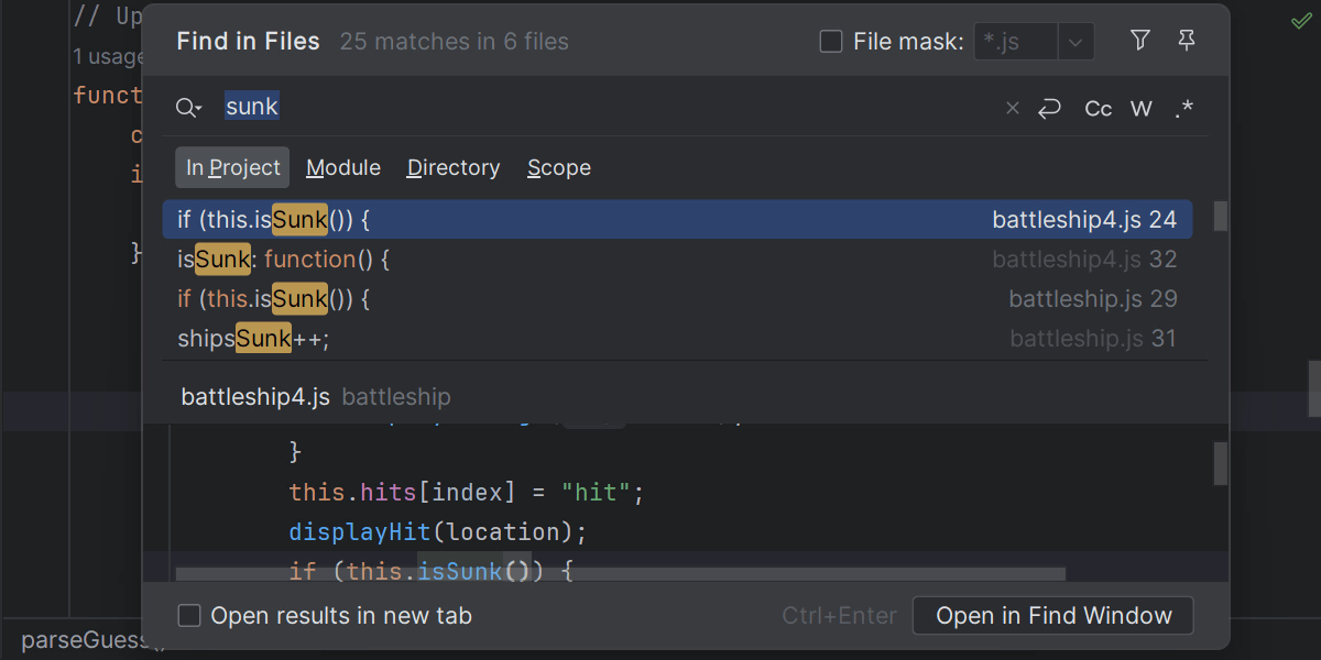您可以使用专属文本字符串搜索。 它让您可以在特定文件和整个项目内查找并替换文本字符串。 您可以使用各种项目作用域和筛选器将搜索范围缩小到文件中的所选代码段。