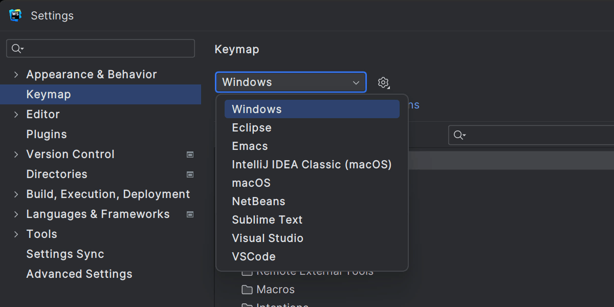 为了帮助您保持生产力,WebStorm 几乎为每项操作都提供了快捷键。 您可以使用预定义的键盘布局,也可以创建自己的键盘布局。 按键映射包括 VS Code 和 Sublime Text 等。