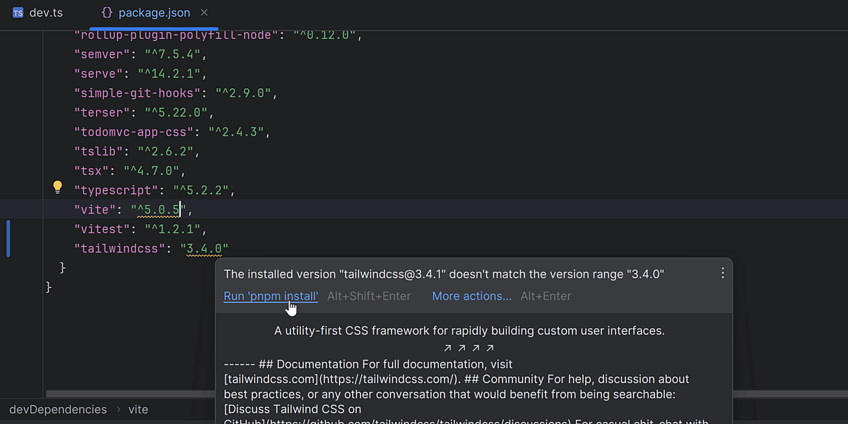 WebStorm 与 npm、Yarn 和 pnpm 集成,使您可以使用首选软件包管理器从 IDE 内部安装、查找、更新和移除软件包。