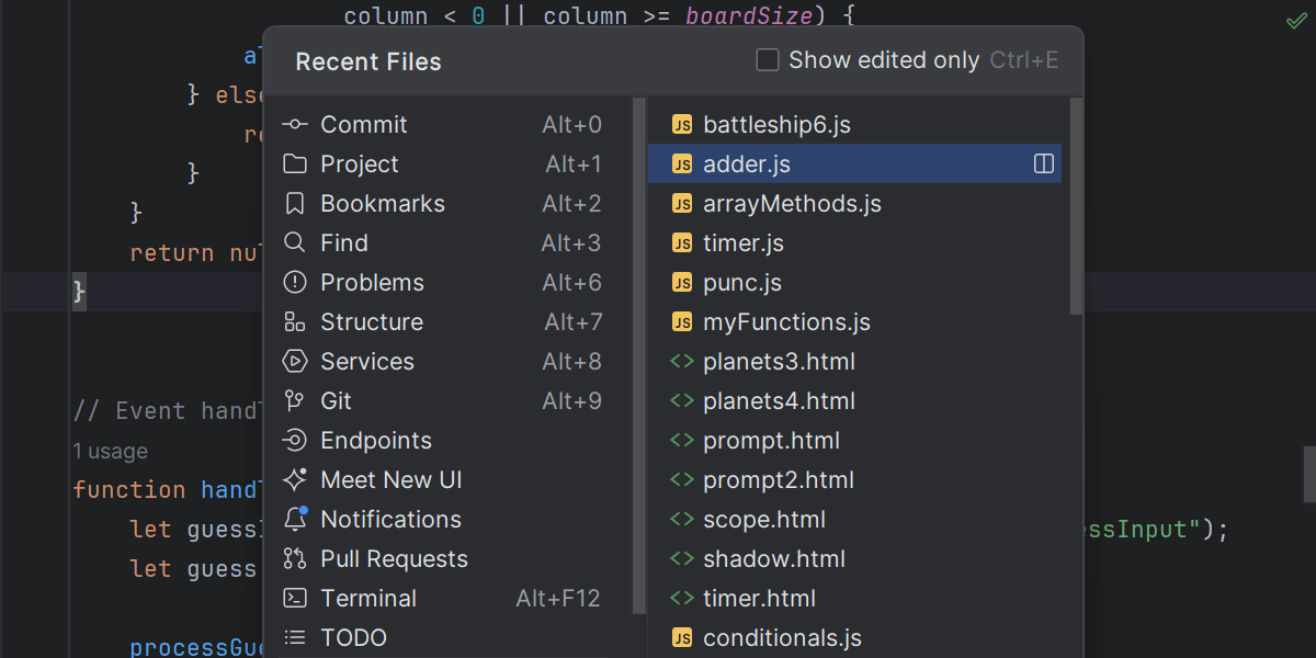 浏览所有项目文件,或者仅在最近的文件或代码修改部分之间跳转 – WebStorm 会记住您所处理的内容并快速返回至该位置。 使用标签页进行导航,或将其关闭并改用快捷键。