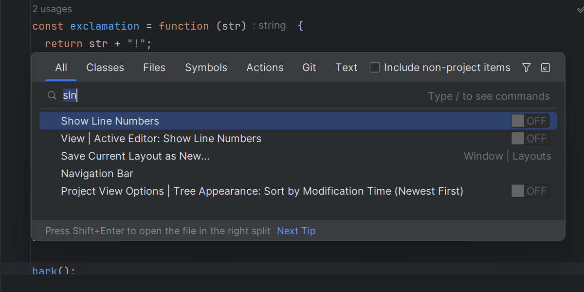 不知道从哪里开始? Search Everywhere(随处搜索)弹出窗口 (Shift+Shift) 将帮助您在 WebStorm 中查找几乎所有内容。 使用它可以查找 IDE 操作、文件、类或符号,或文本字符串,并在一个地方查看所有匹配条目。