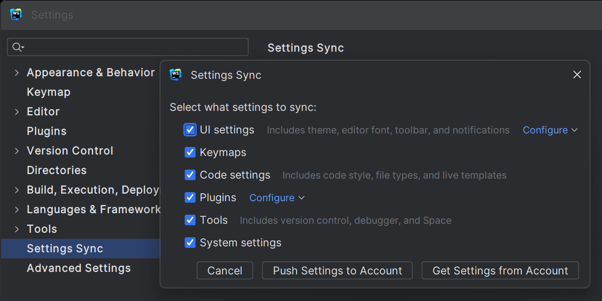 您可以在 JetBrains IDE 之间共享设置,获得一致且熟悉的工作环境。 您可以选择要同步的设置,包括 UI、代码与系统设置、按键映射、插件和工具。