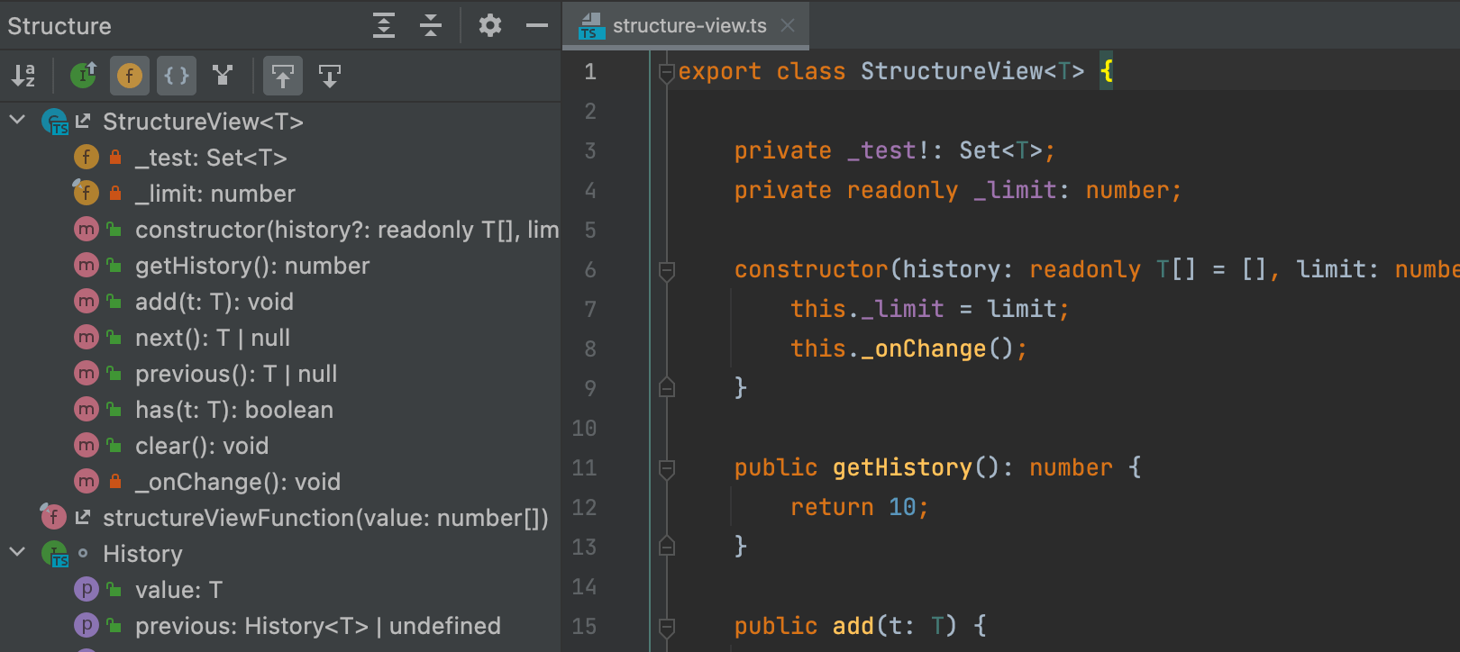 使用 结构 视图,您可以更快地检查您的文件并跳转到其特定部分。 在此版本中,我们简化了检查 JavaScript 和 TypeScript 文件的过程。 文件中的符号现在以更有逻辑的顺序呈现。 此外,WebStorm 现在将在已导出符号旁边显示导出图标,使其更易于辨别。