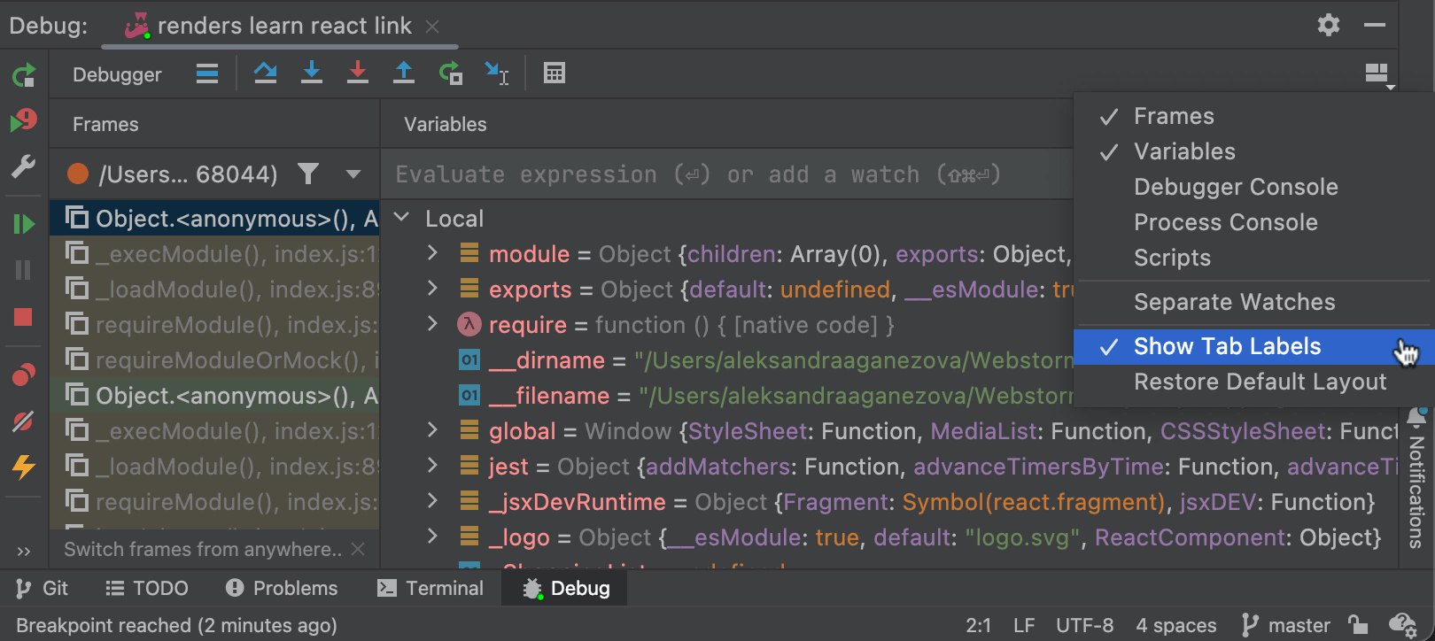 为了最大化 Debugger(调试器)工具窗口中的可用空间,我们默认隐藏了标签页标签。 要使其再次可见或自定义它们的位置,请使用 Layout Settings(布局设置)下的 Show Tab Labels(显示标签页标签)选项。