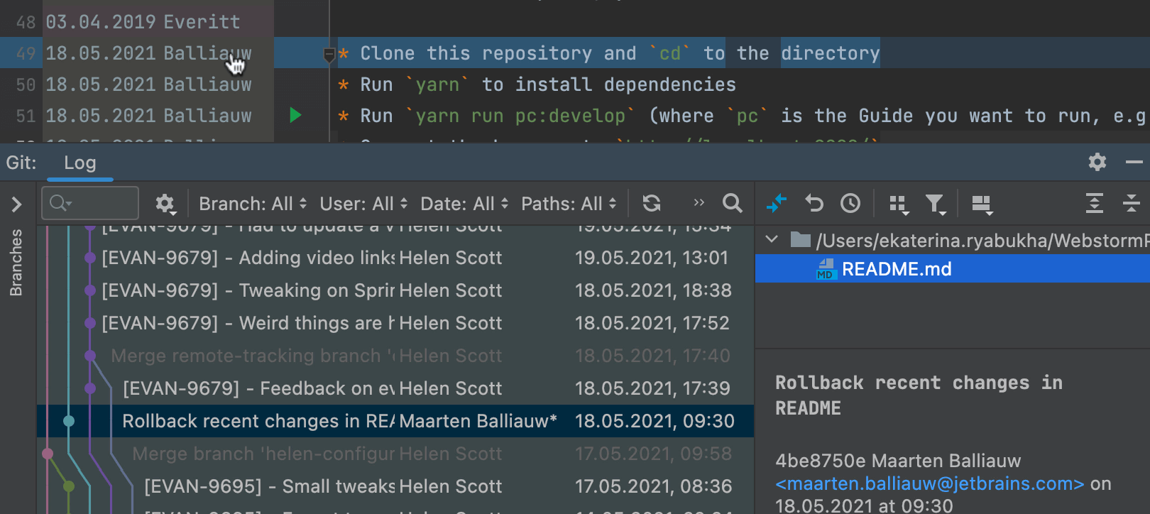 我们改进了 Annotate with Git Blame(使用 Git 追溯注解)功能,使引入的更改更易于调查。 将鼠标悬停在注解上时,IDE 会在编辑器中高亮显示行中的差异,点击后,它会打开 Git 工具窗口下的 Log(日志)标签页。