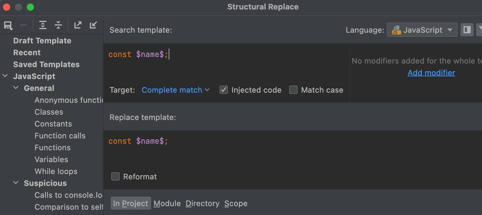 Structural Search and Replace(结构化搜索和替换)对话框现在包含所有模板的列表,可以实现更轻松的导航。 我们还在对话框右上角添加了 Pin Dialog(固定对话框)图标,并将 Injected code(注入的代码)和 Match case(匹配大小写)复选框移至 Search template(搜索模板)窗格底部。