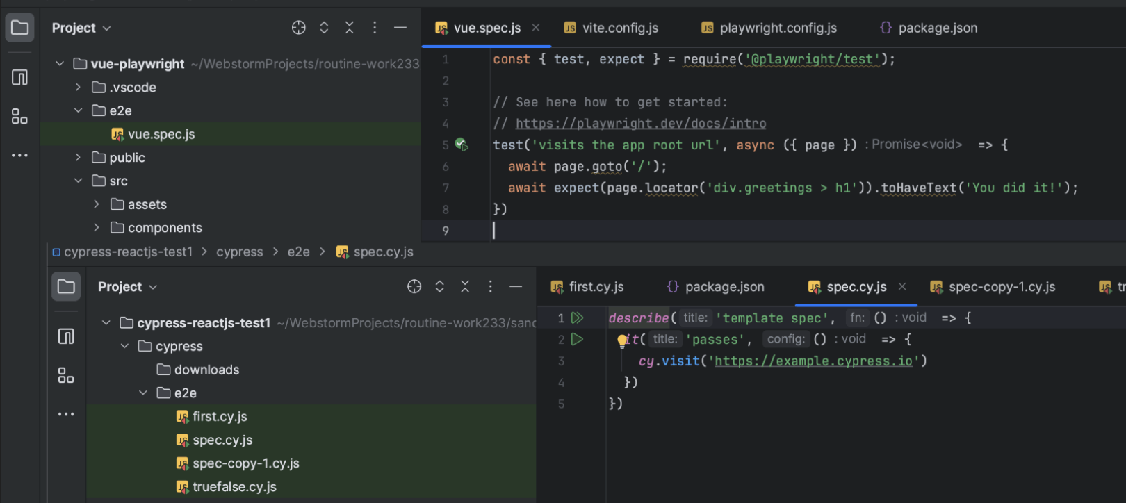 WebStorm 将自动检测 Cypress 和 Playwright 测试,然后让您一键运行和调试。 支持还包括通过浏览测试树探索结果和发现问题的功能。 您可以通过 测试自动化插件 扩展支持,该插件将提供嵌入式浏览器和高级代码洞察。