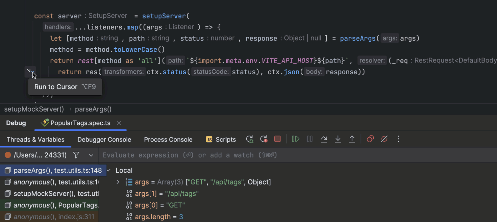 新的 Run to Cursor(运行到光标)嵌入选项允许您在调试时快速执行到特定代码行。 程序挂起后,您可以将鼠标悬停在要执行到的代码行上,然后点击 Run to Cursor(运行到光标)弹出窗口。 您还可以在将文本光标置于所需行上后调用 Alt+F9 来使用此功能。