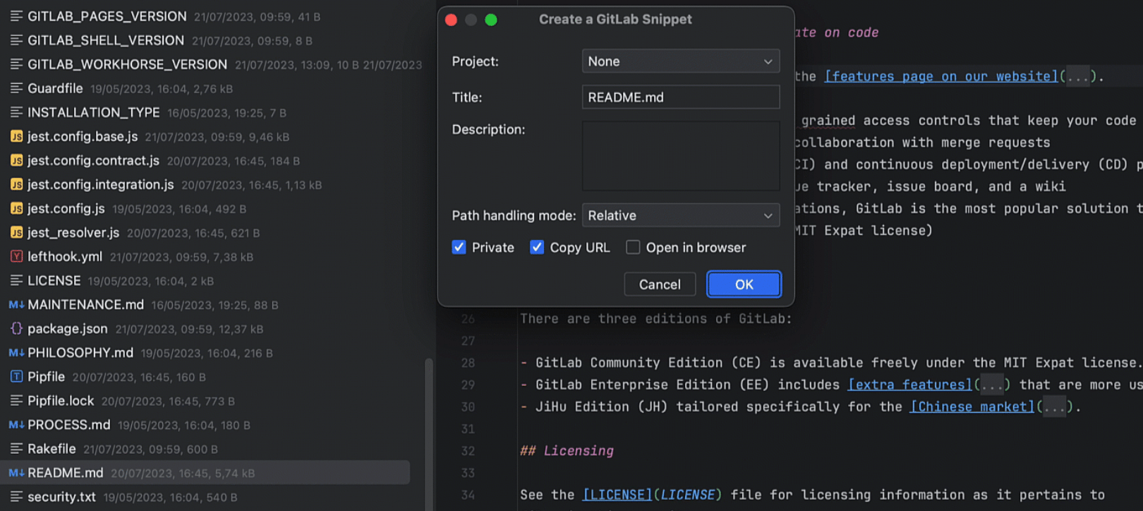 为了扩展 CLion 2023.2 版本中引入的 GitLab 集成,我们添加了对 GitLab 代码段的支持。 您现在可以直接在 IDE 中创建公共或私有代码段。