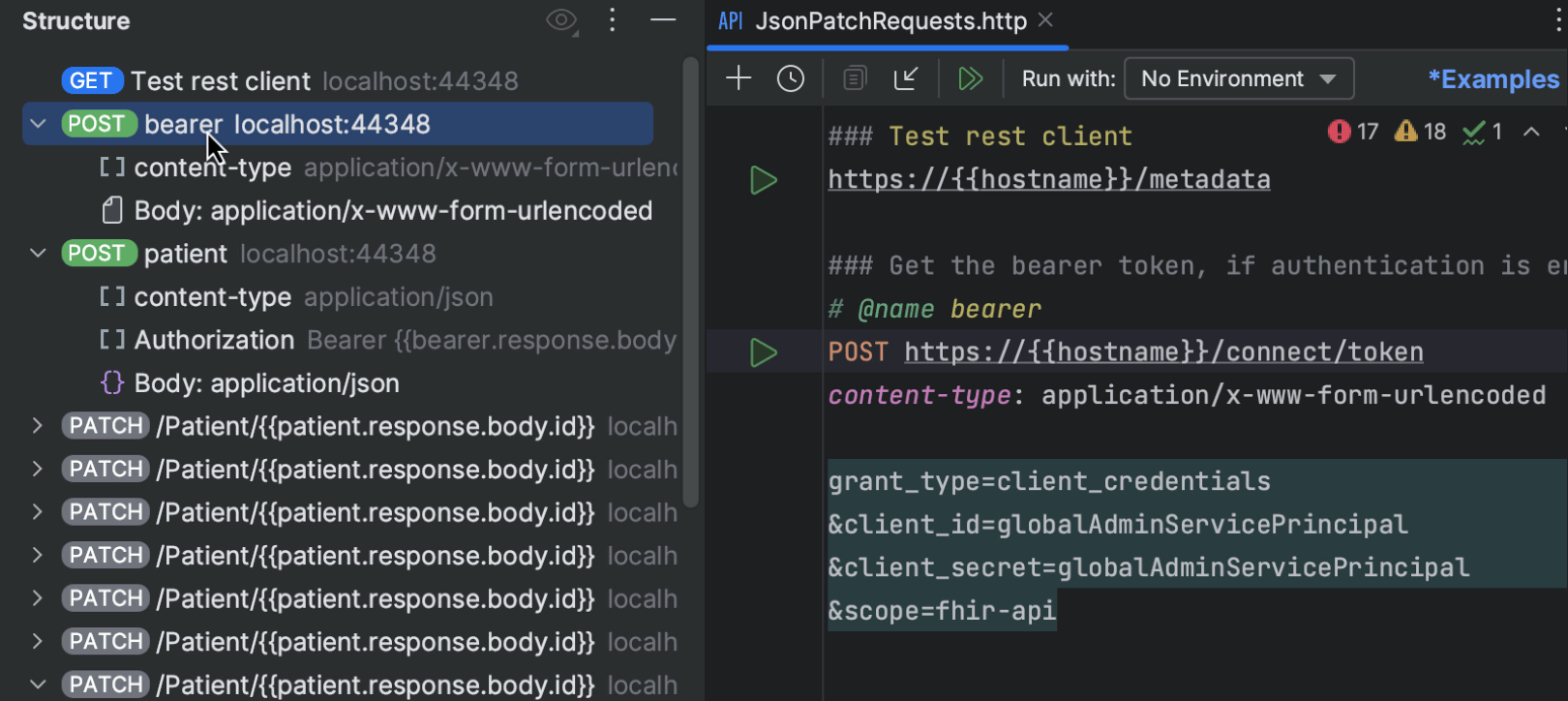 我们改进了 Structure(结构)视图,在大型 .http 文件中提供更好的导航。 此更新还为请求类型引入了颜色编码标签,可以更清晰地列出内容。 我们还支持使用 @ 声明变量以及使用 OAuth 2.0 密码和客户端凭据授予类型进行身份验证。