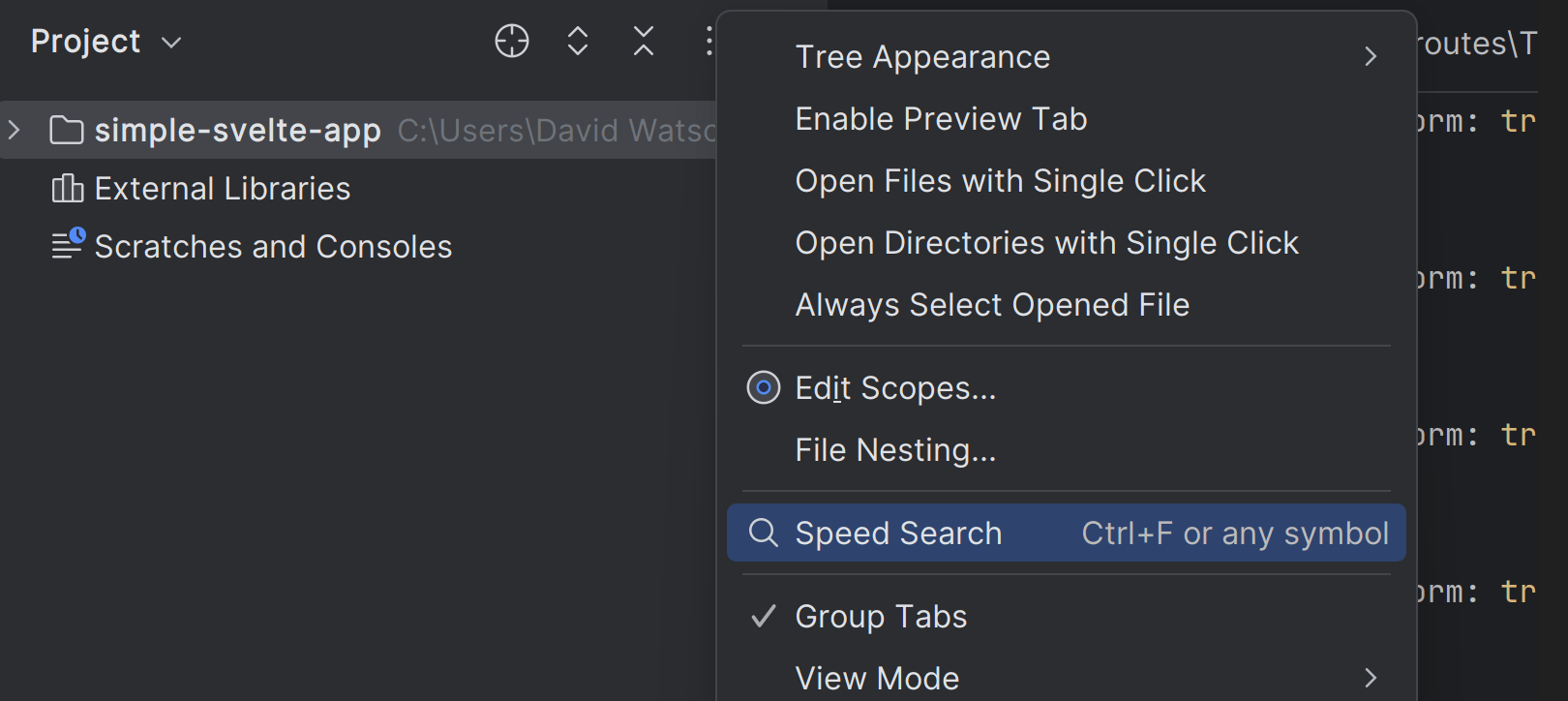 Speed Search(快速搜索)功能允许您在工具窗口和对话框中快速导航,现在可以通过快捷键使用。 将焦点置于树或列表上后,即可按 Ctrl+F 从工具窗口的 Options(选项)菜单调用搜索。