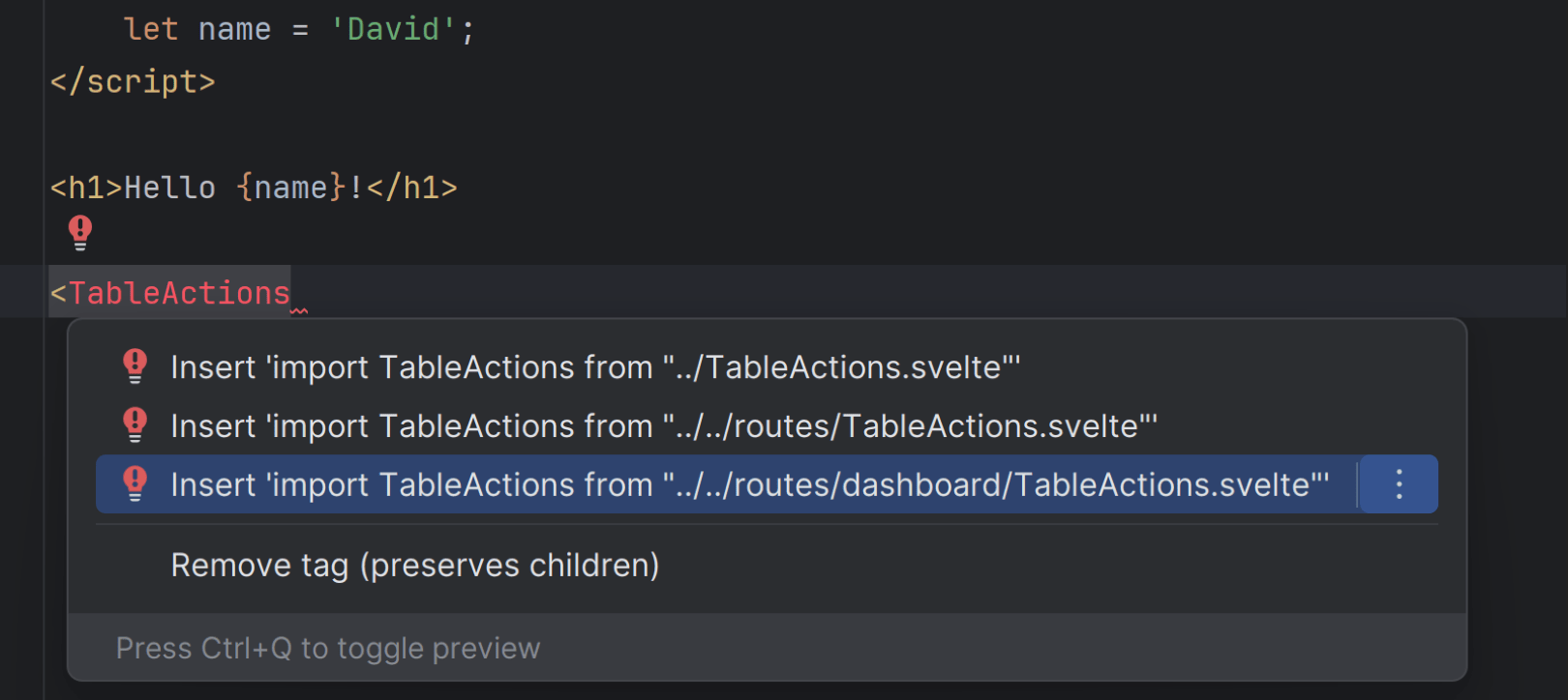 我们已为您的 Svelte 项目增加了对 TypeScript 插件 的内置支持,以提供一致的 高亮和快速文档 用于 TypeScript 文件。 我们实现了一种更稳定的自动导入组件的方式,它可以在补全、复制粘贴以及按 Alt+Enter 时运行。 我们还改进了对 context="module" 脚本导出的支持,并扩展了对零努力类型安全的支持,覆盖 Svelte 文件以及 TypeScript 文件。