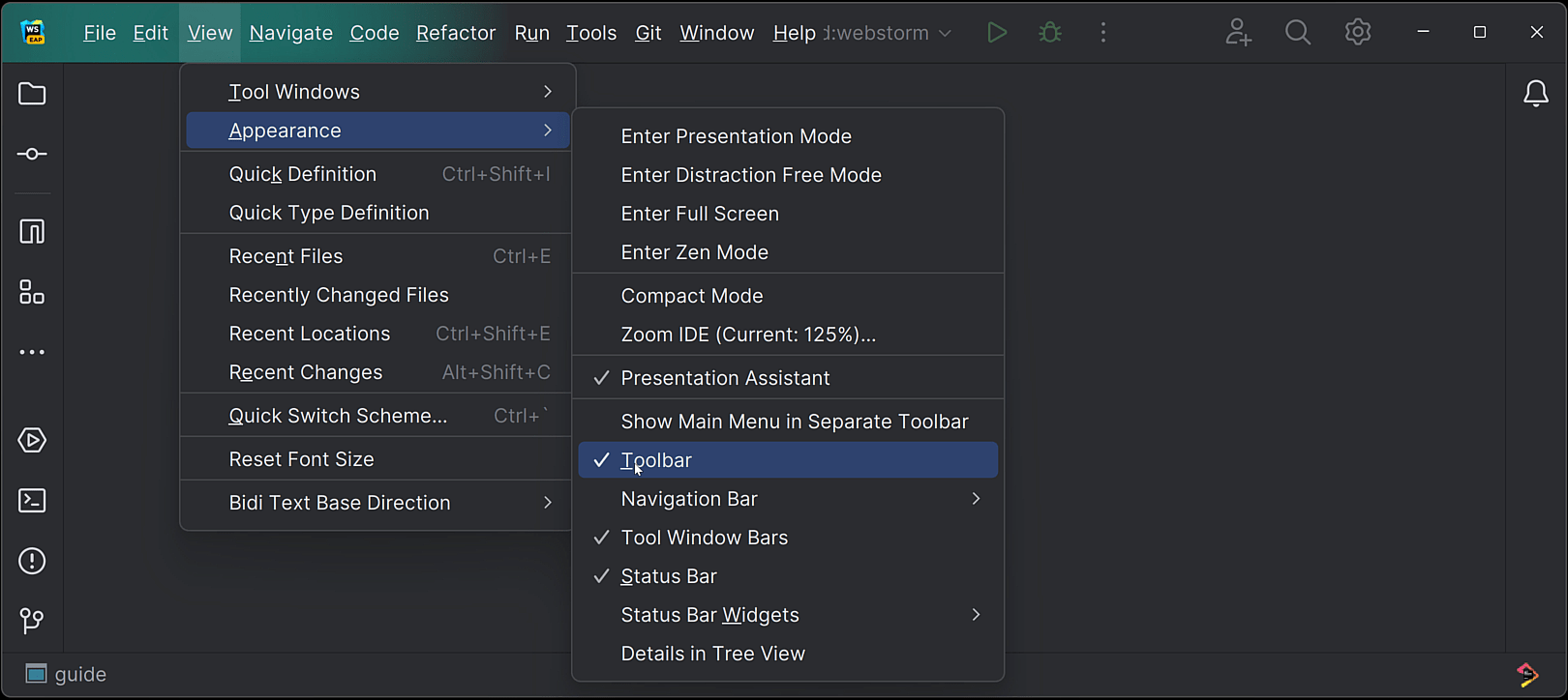 我们实现了在使用 IDE 的默认查看模式时隐藏主工具栏的选项。 要隐藏主工具栏,首先从主菜单选择 View | Appearance(视图 | 外观),然后取消选中 Toolbar(工具栏)选项。