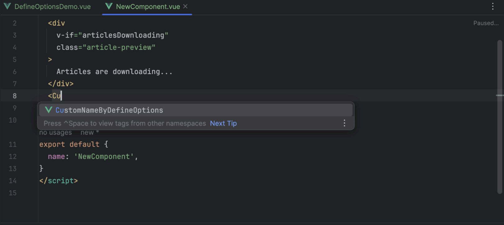 我们添加了对 defineSlots 的支持,为 slot 名称和属性提供补全和导航,以及重命名重构。 补全现在也适用于带有 defineExpose 的属性。 此外,组件的必需 import 将根据 defineOptions 函数指定的名称添加。