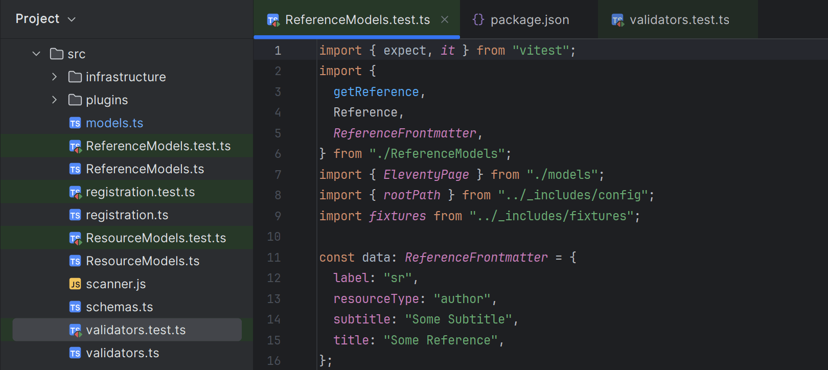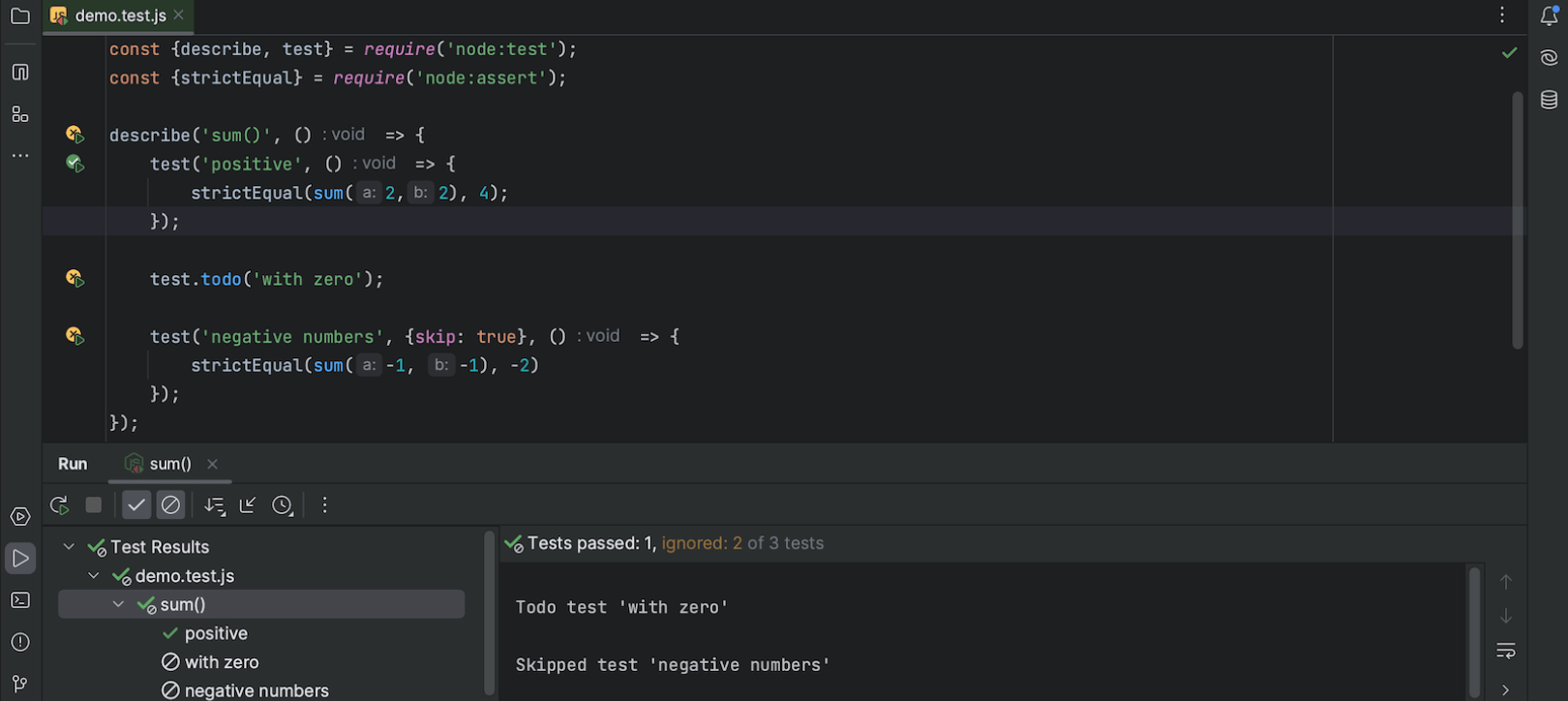 我们还添加了对原生 Node.js 测试运行程序的支持。 使用 node:test API 声明的测试已可识别,您可以通过装订区域图标运行和调试它们。 我们计划在下一个版本中实现更多改进来扩展支持。