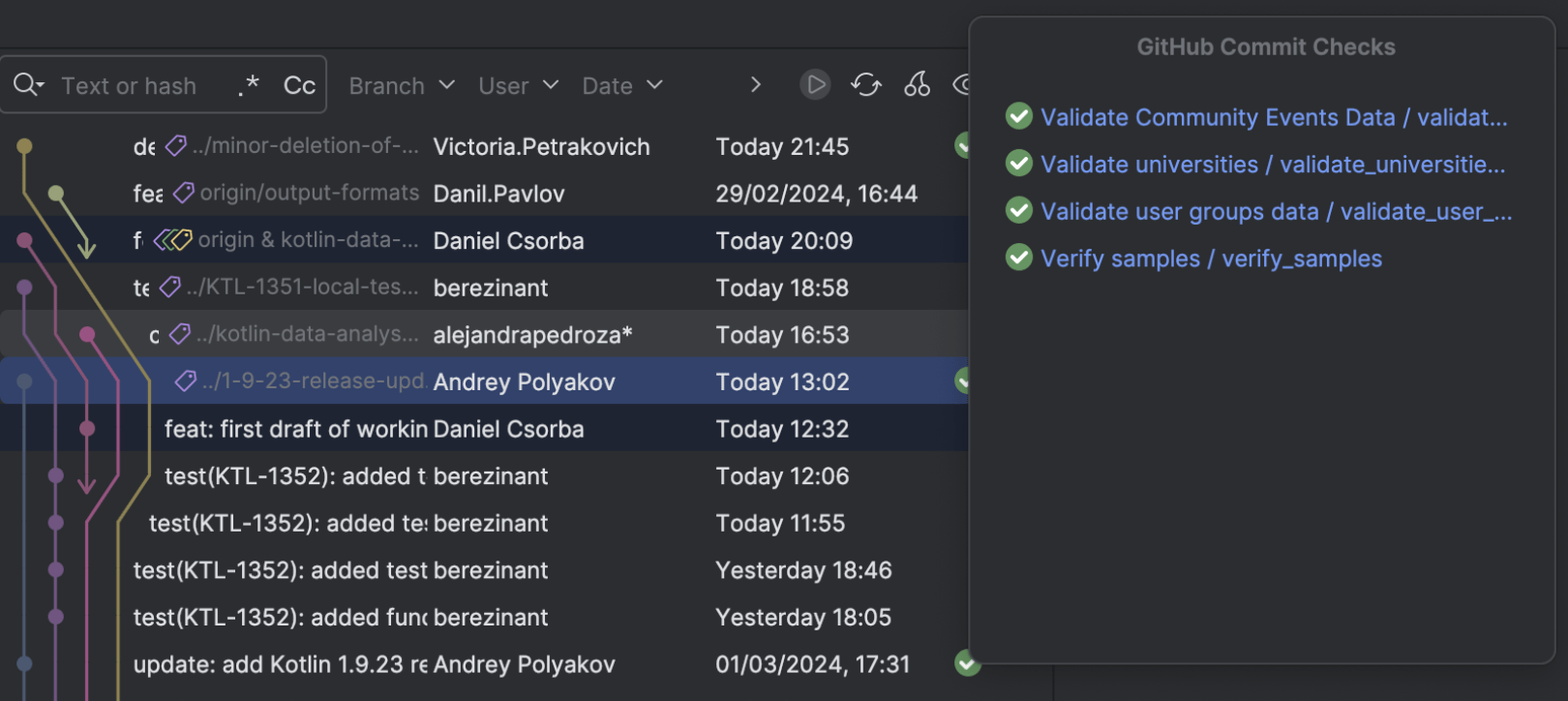 WebStorm 2024.1 通过分支相关更改的集中视图简化了代码审查。 对于 GitHub 和 GitLab,您可以点击 Pull Requests(拉取请求)工具窗口中的分支名称,然后从菜单选择 Show in Git Log(在 Git 日志中显示)。 这将打开 Log(日志)标签页,显示分支中的所有更改。