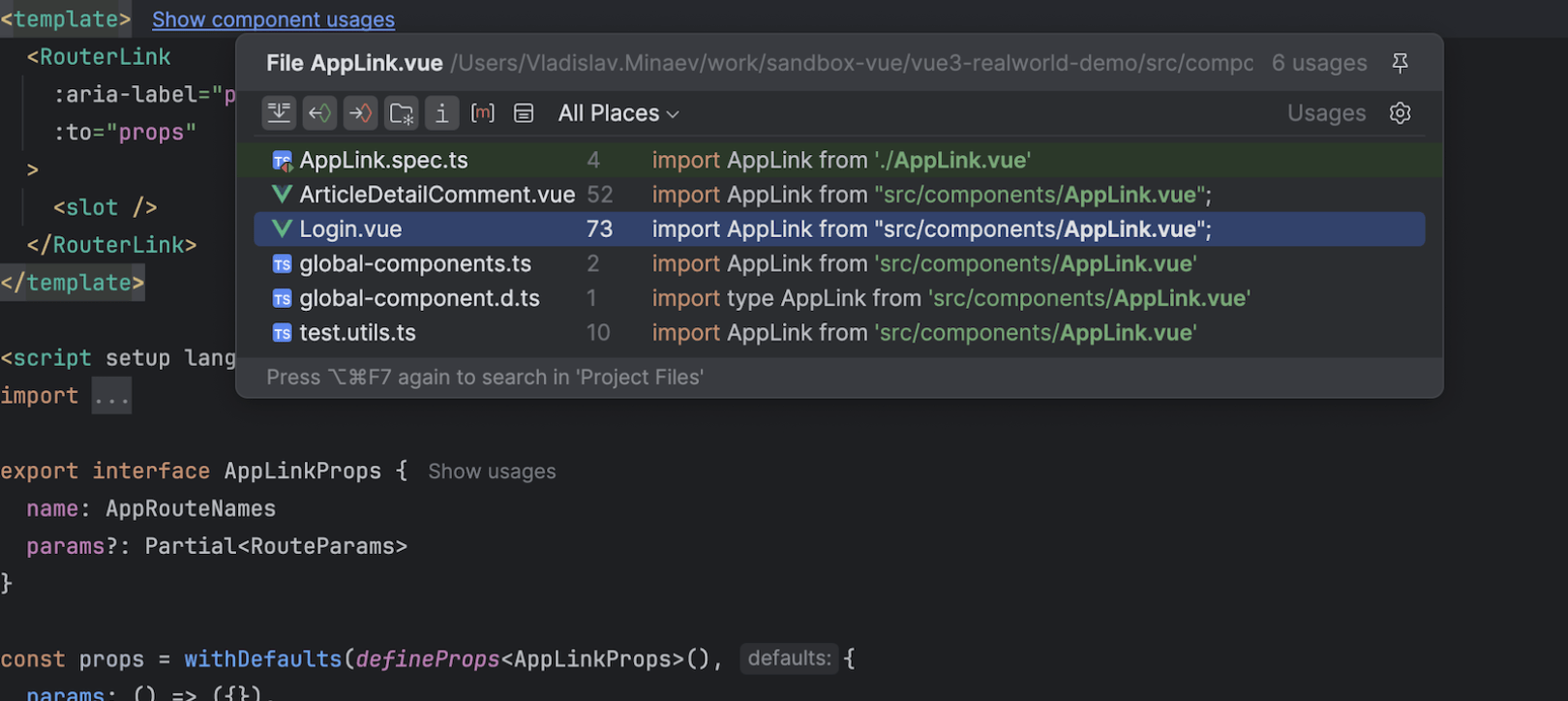 WebStorm 现在为 Vue、Svelte 和 Astro 文件中的组件用法提供编辑器内提示。 这将帮助您快速找到项目中任意位置特定组件的所有用法。