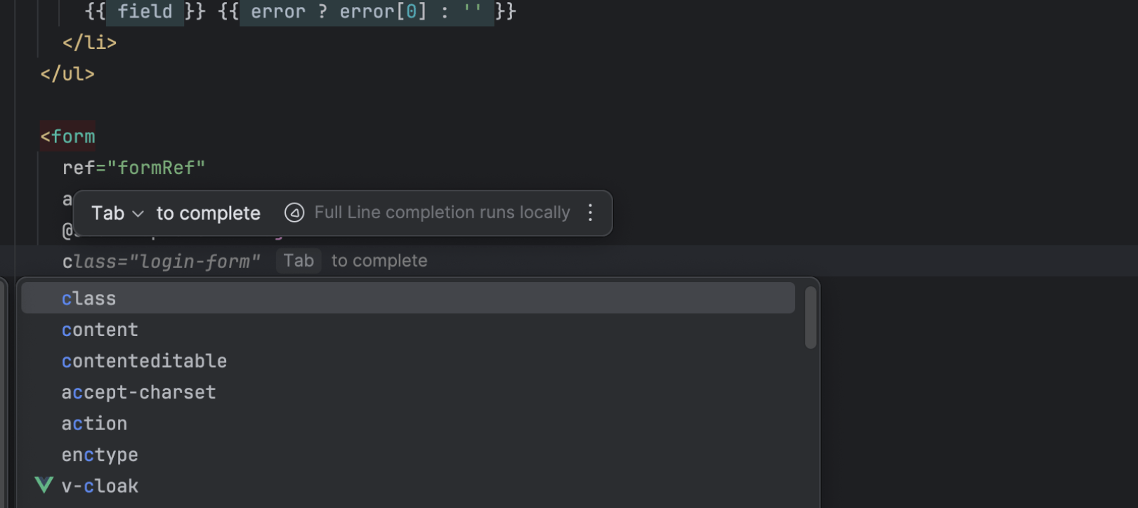 此发布版本具有针对 Vue 的 v-bind 同名简写(在 v3.4 的框架中引入)的支持。 支持包括引用解析、查找用法、补全、文档和检查。