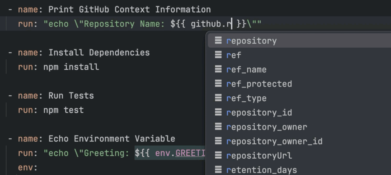 WebStorm 2024.1 为 GitHub Actions 上下文引入了自动补全,包括 github.*、env.*、steps.* 和 inputs.*。 我们还为 image 和 main Docker 配置属性添加了补全。