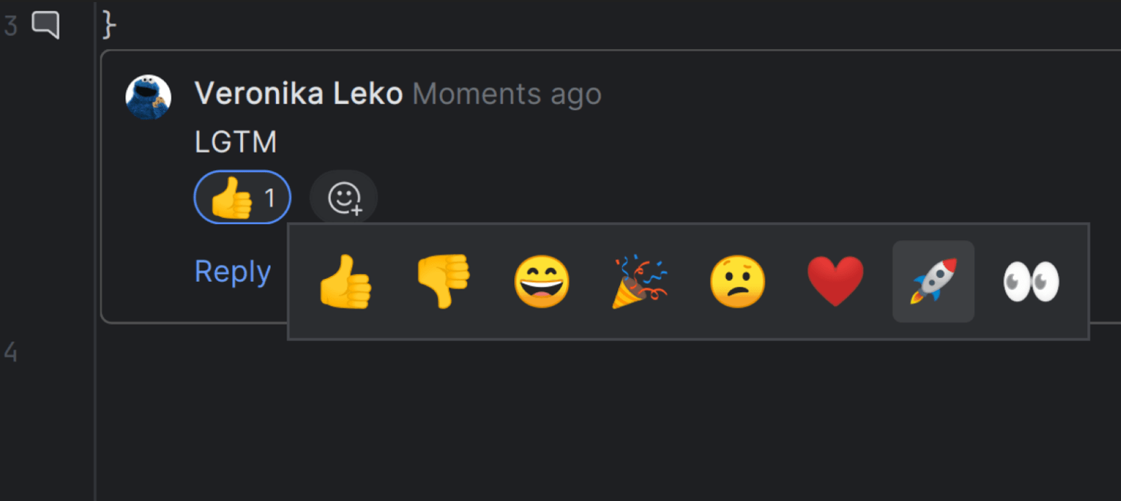 WebStorm 2024.1 带来了对 GitHub 拉取请求和 GitLab 合并请求的审查评论回应的支持。 现在,您可以从一组表情符号中进行选择,对代码审查评论添加回应。
