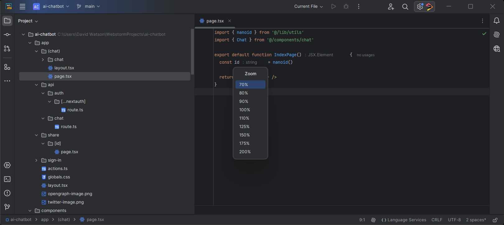 在 WebStorm 2024.1 中,我们扩展了 IDE 缩放选项。 现在,除了先前的 100% 到 200% 范围之外,您还可以将 IDE 缩小到 70%。 这可用于轻松调整 UI 大小,使空间中容纳更多内容。
