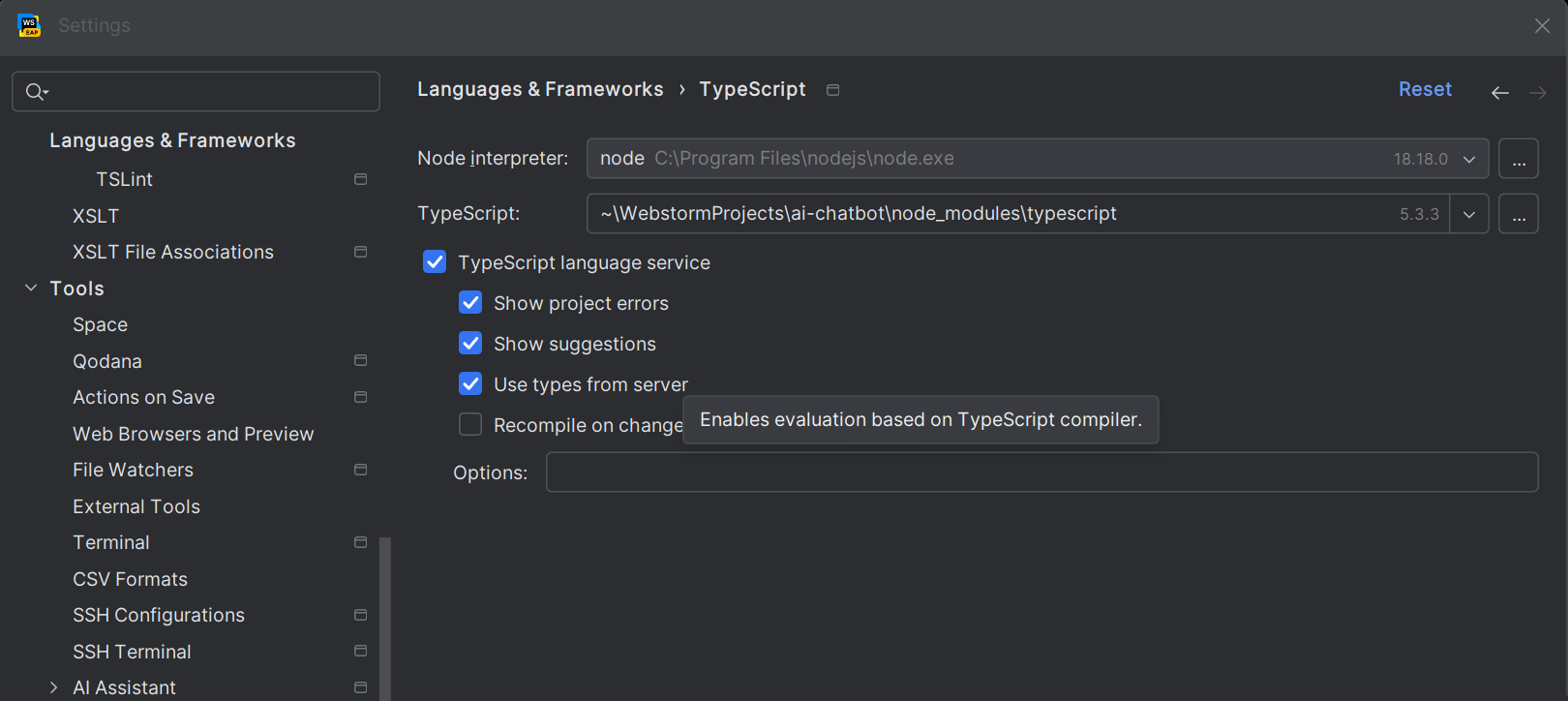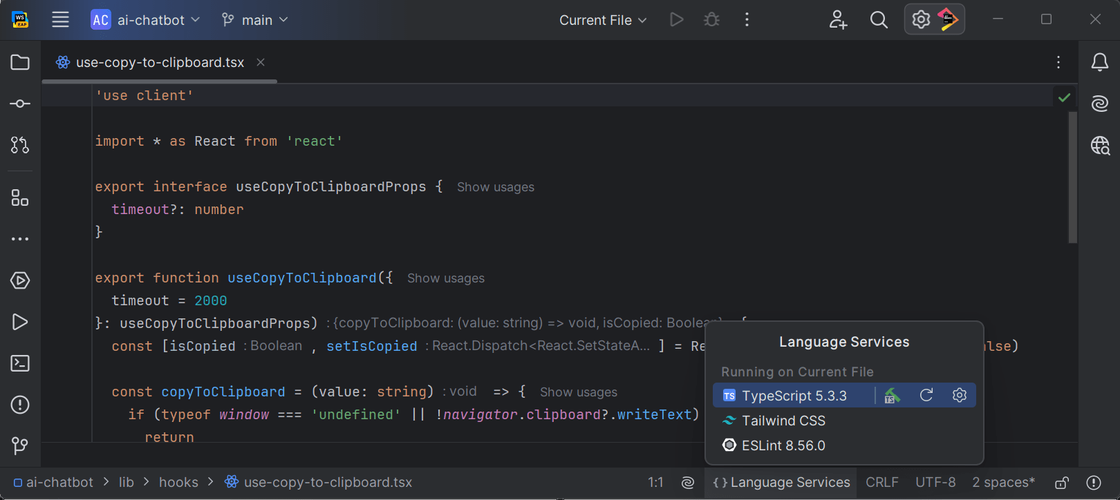 2024.1 版本附带实验性 TypeScript 引擎,可以通过 Settings | Languages & Frameworks | TypeScript(设置 | 语言和框架 | TypeScript)切换。 新引擎的作用是解决兼容性问题和提高性能。 新方式目前适用于 TypeScript 和 Vue。 有关详情,请参阅此博文。