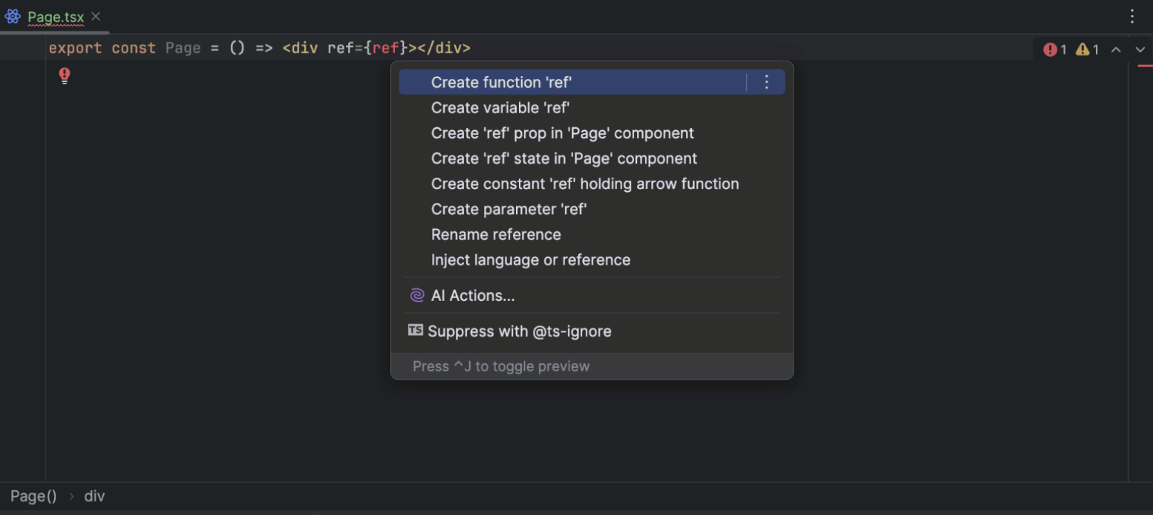 WebStorm 2024.1 为 React 新引入了多个快速修复,可供动态创建 props 和状态。 您可以使用快捷键 Alt+Enter 应用这些快速修复。 有关详情,请阅读这篇博文。