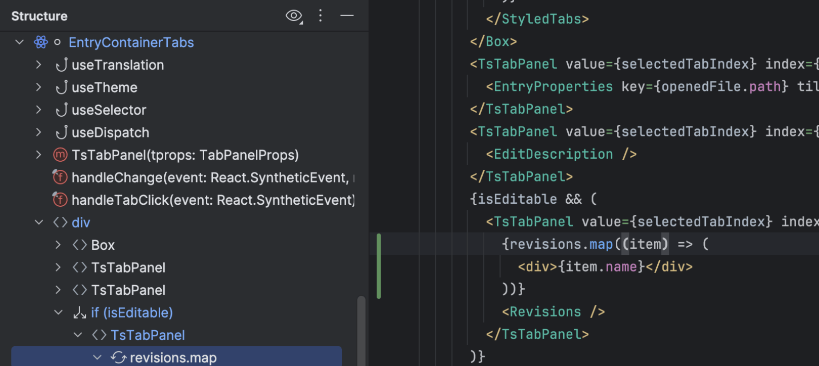 Structure(结构)工具窗口现在显示 React 组件和挂钩,以及 JSX 结构,包括用于条件和列表呈现的节点。 此外,JSX 驱动库也受支持,例如 Preact 和 Solid。