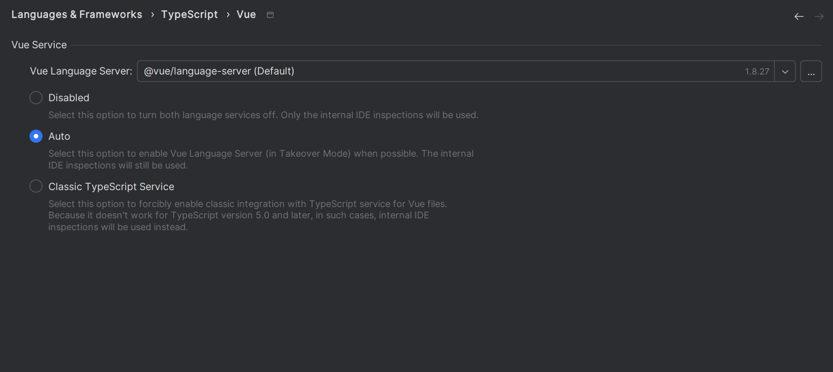 现在,所有 Vue 项目(包括基于 Nuxt 的项目)均默认启用 Vue Language Server。 它在 Vue 2 项目中存在一些已知限制。 如果您处理 Vue 2 项目 ,可以在 Settings | Languages & Frameworks | TypeScript | Vue(设置 | 语言和框架 | TypeScript | Vue)中选择不使用服务器。