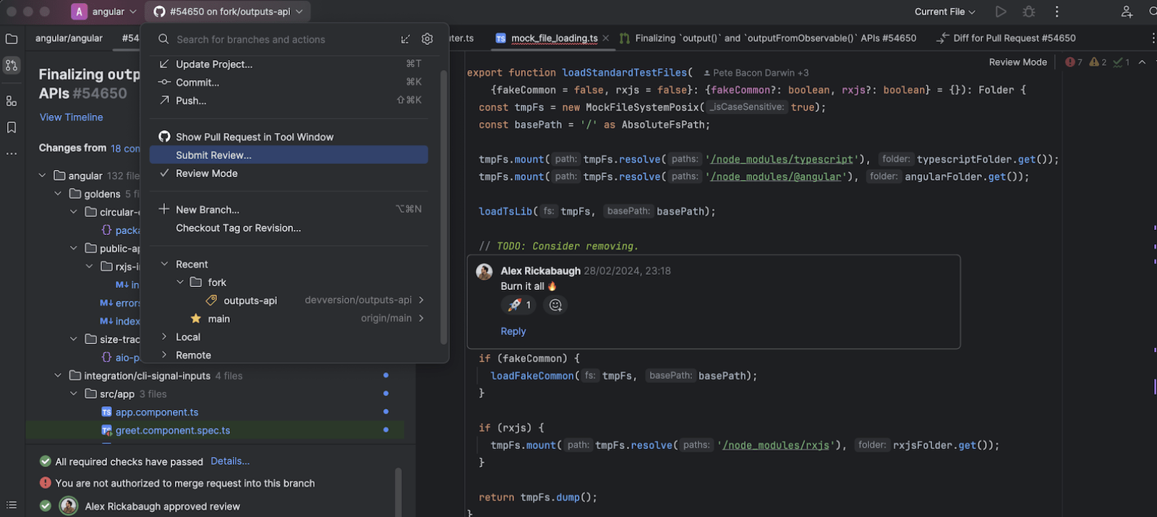 WebStorm 2024.1 为 GitHub 和 GitLab 用户改进了代码审查流程。 新的审查模式通过装订区域中的紫色标记高亮显示更改,对作者和审查者可见。 您可以点击 + 或 Message(消息)图标直接在编辑器中开始新讨论或查看和回复评论。