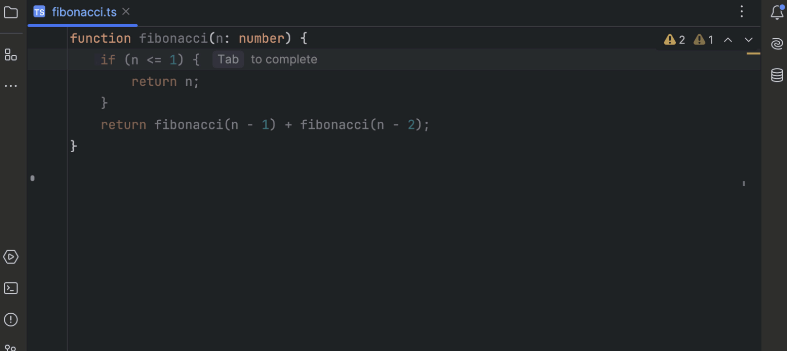 我们已努力解决有关 AI Assistant 质量的主要问题。 此版本改进了 JavaScript 和 TypeScript 的代码补全,并增加了对 HTML 和 CSS 的支持。 通过将本地的整行建议与来自 JetBrains 内部 LLM 的基于云的建议相结合,我们提高了速度和准确性,同时减少了无关建议。
