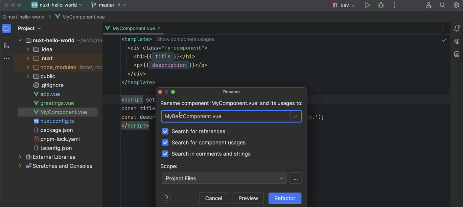 我们增强了针对 Vue、Svelte 和 Astro 组件的编辑器内提示。 Show component usages(显示组件用法)操作现在可以在 import 和标记模板中查找用法。 我们还添加了 Show Component Usages(显示组件用法)筛选器,以便在搜索常规文件引用时排除组件用法。 Rename(重命名)重构也已更新,现在可以在重命名组件文件时包含用法。