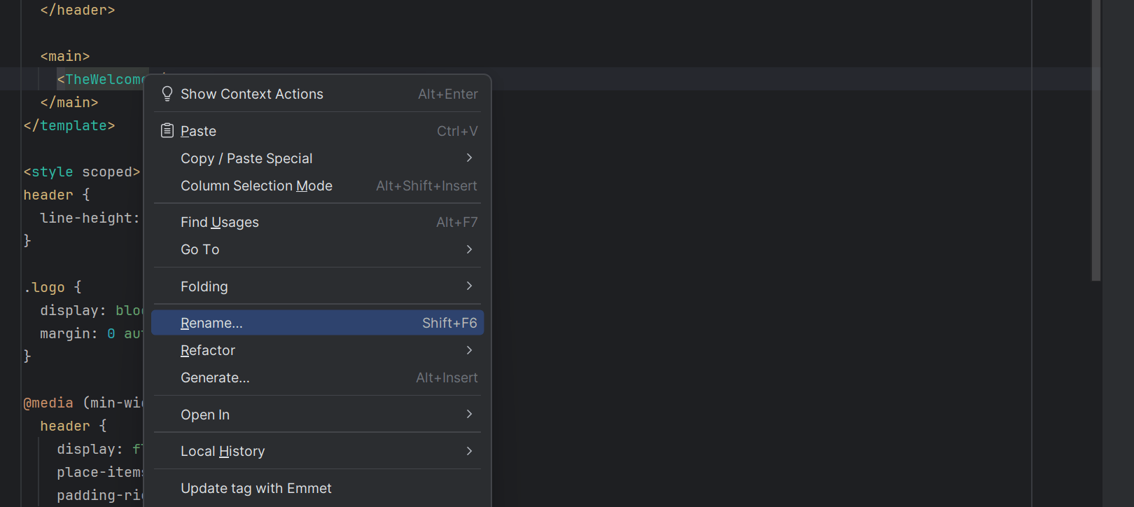 我们优化了 Rename(重命名)操作在编辑器和 Project(项目)工具窗口中的元素上调用时在上下文菜单中的位置。 此操作现在位于顶层,使快速重命名文件、变量和其他元素更加简单。