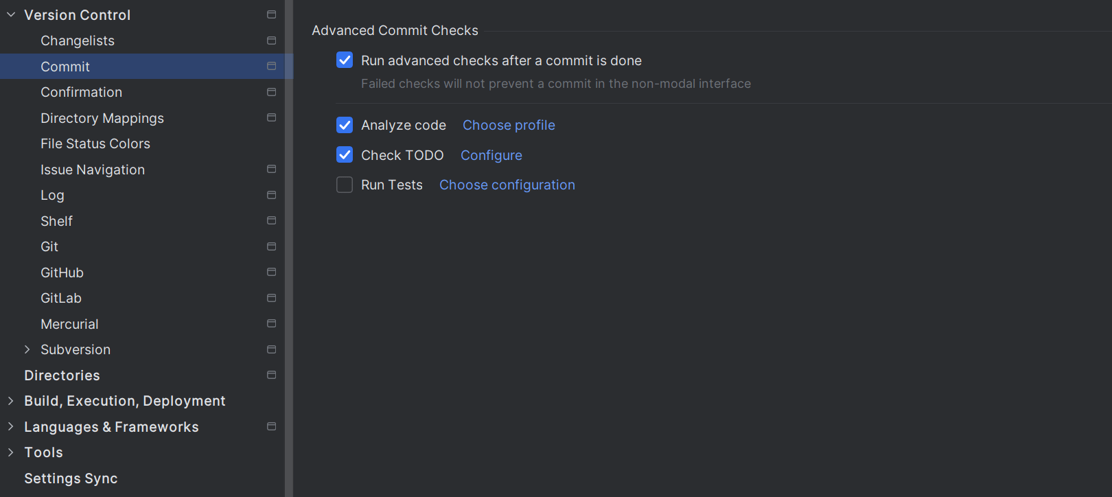 现在,您可以使用 Settings | Version Control | Commit | Advanced Commit Checks | Run advanced checks after a commit is done(设置 | 版本控制 | 提交 | 高级提交检查 | 提交完成后运行高级检查)下的新选项在提交过程中管理后台检查。 通过此设置,您可以决定是否在提交后运行测试和检查。 如果您想等待这些检查完成,禁用此选项即可。