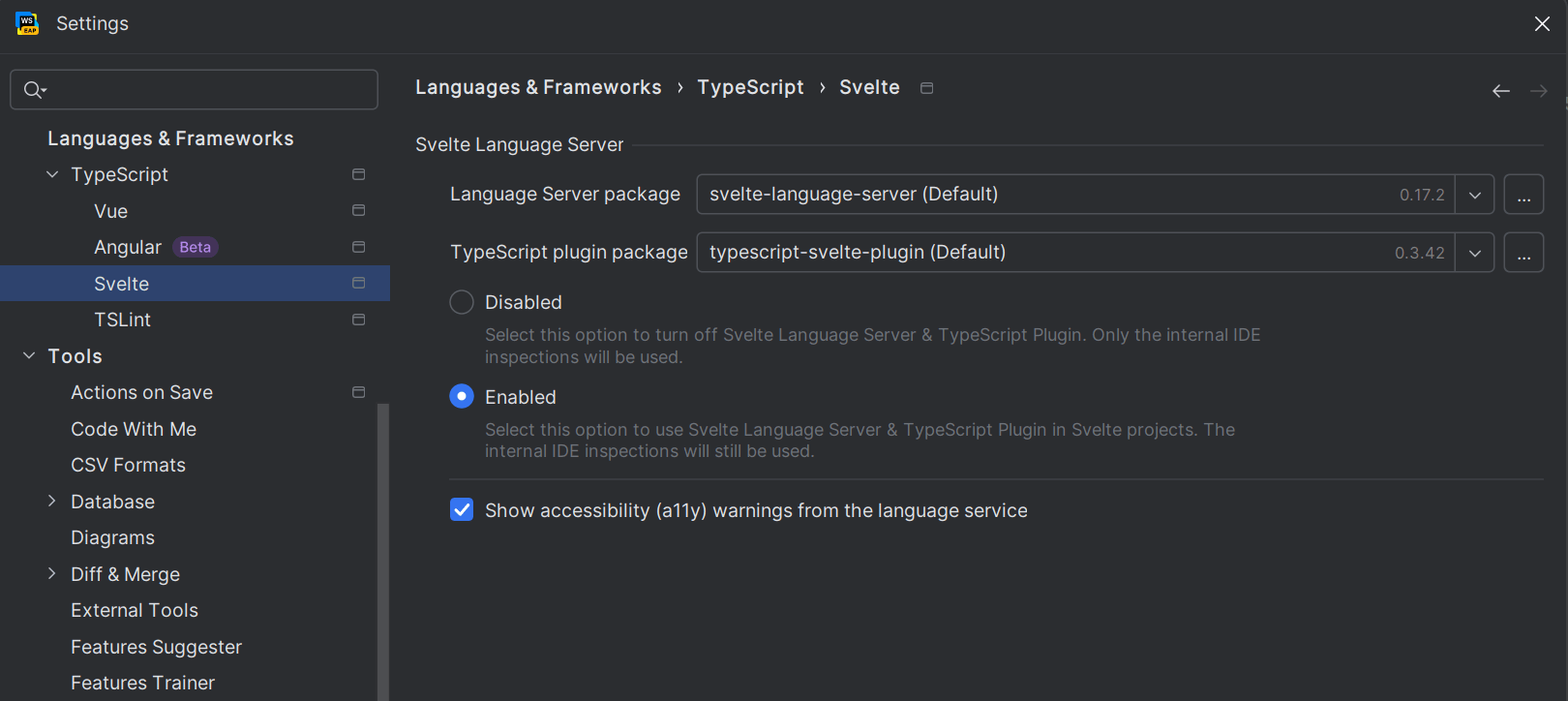 我们增加了对 <script module> 特性的支持,确保这些块中的符号得到正确解析。 此外,还有一个新的复选框可以禁用 SvelteKit a11y 警告,让您更好地控制无障碍功能警告。