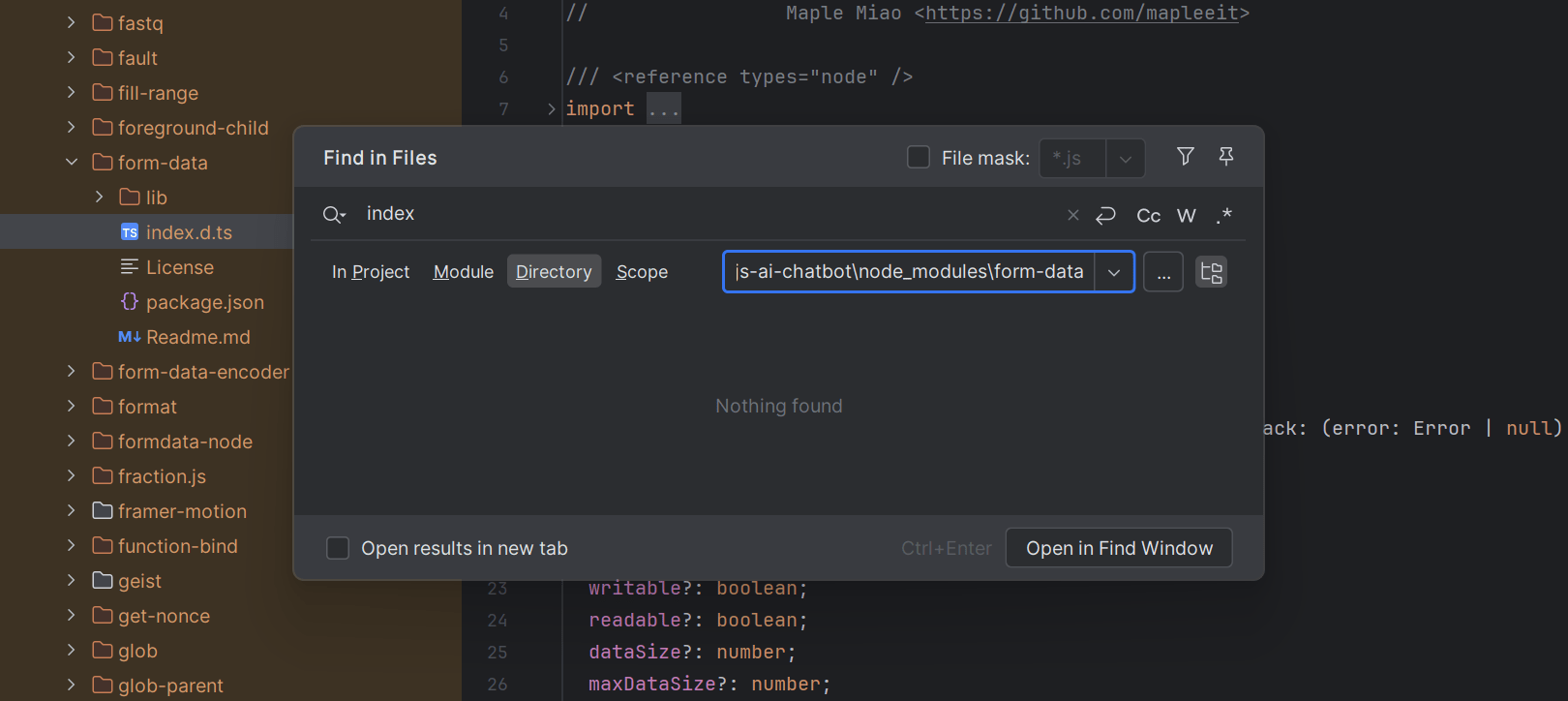 现在,在项目目录中使用 Find in Files(在文件中查找)时,WebStorm 会默认排除 node_modules 结果,减少无关文件造成的混乱。 您可以通过启用 Settings | Advanced Settings(设置 | 高级设置)下的 Search in library files when “Directory” is selected in Find in Files(在“在文件中查找”中选择“目录”时,在库文件中搜索)选项来恢复先前的行为。