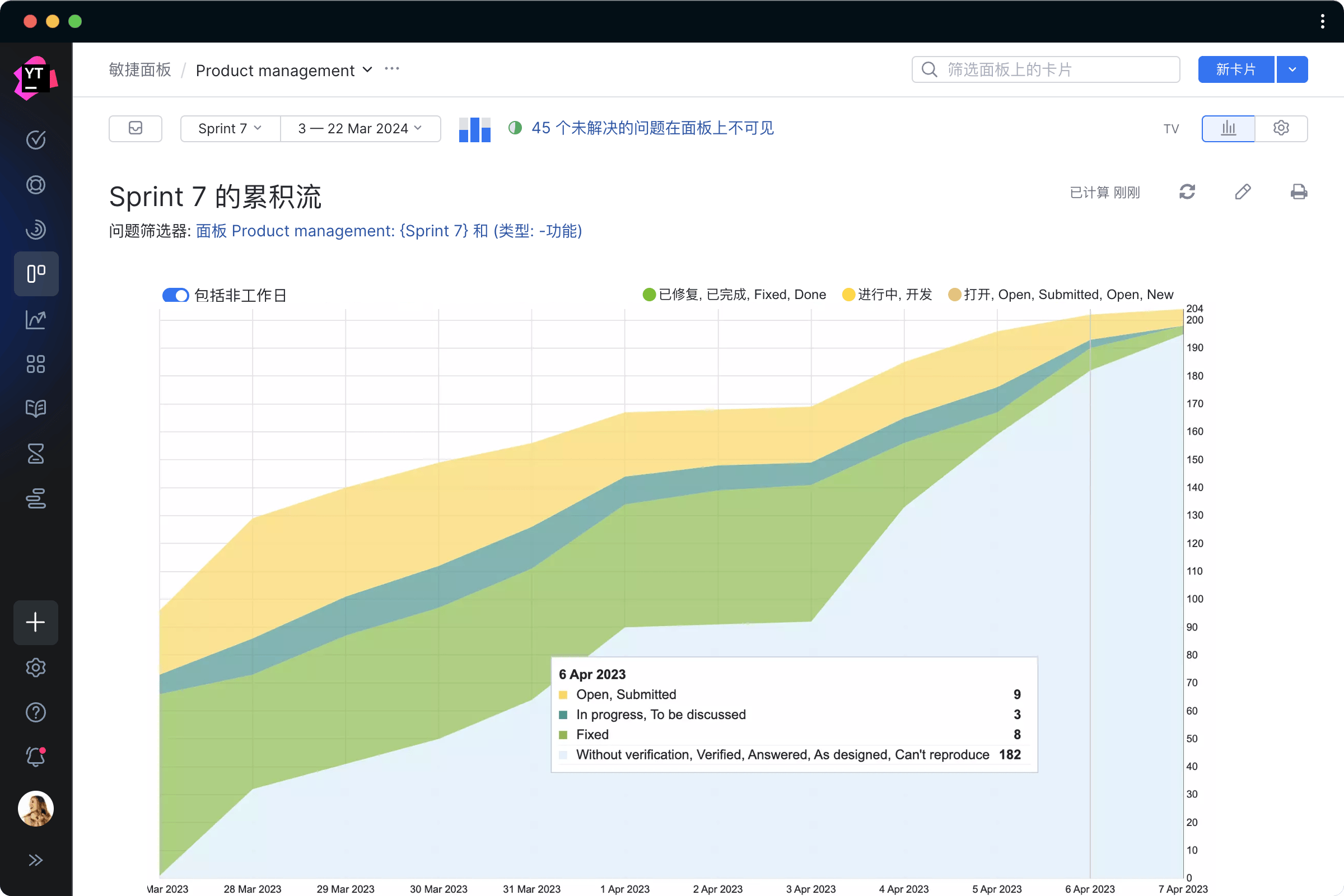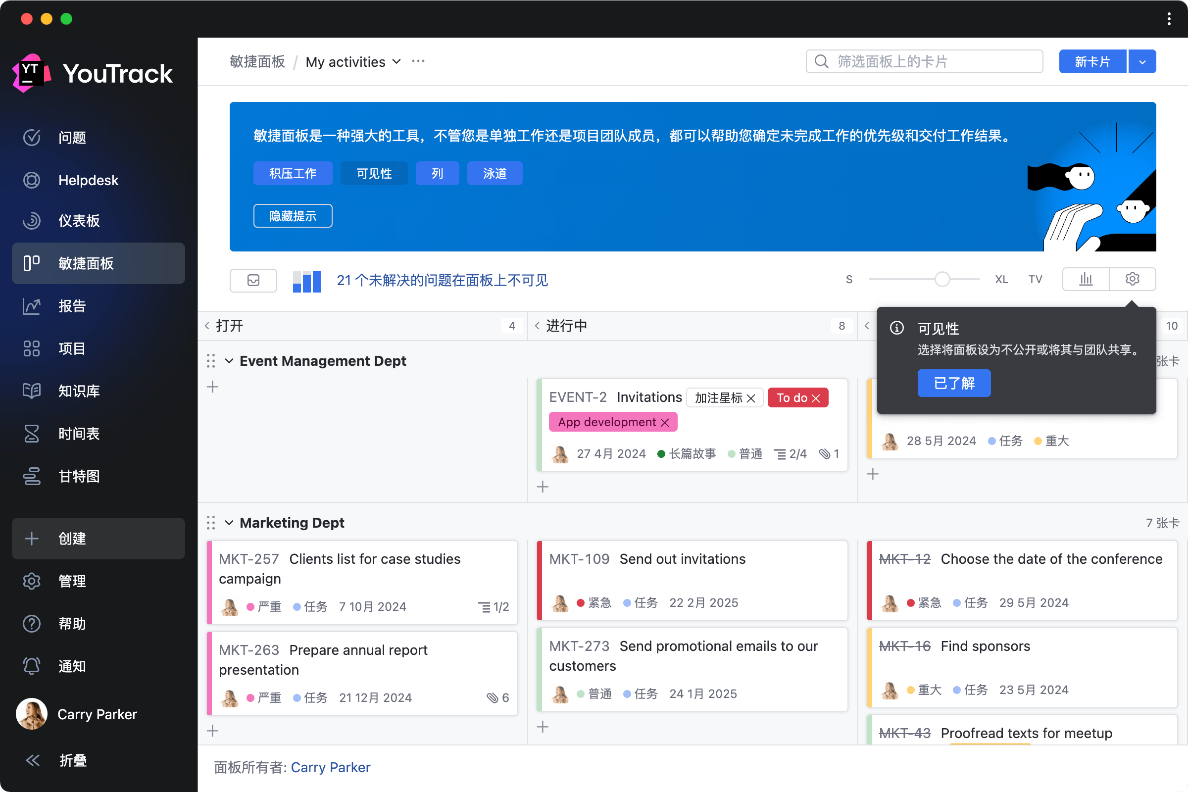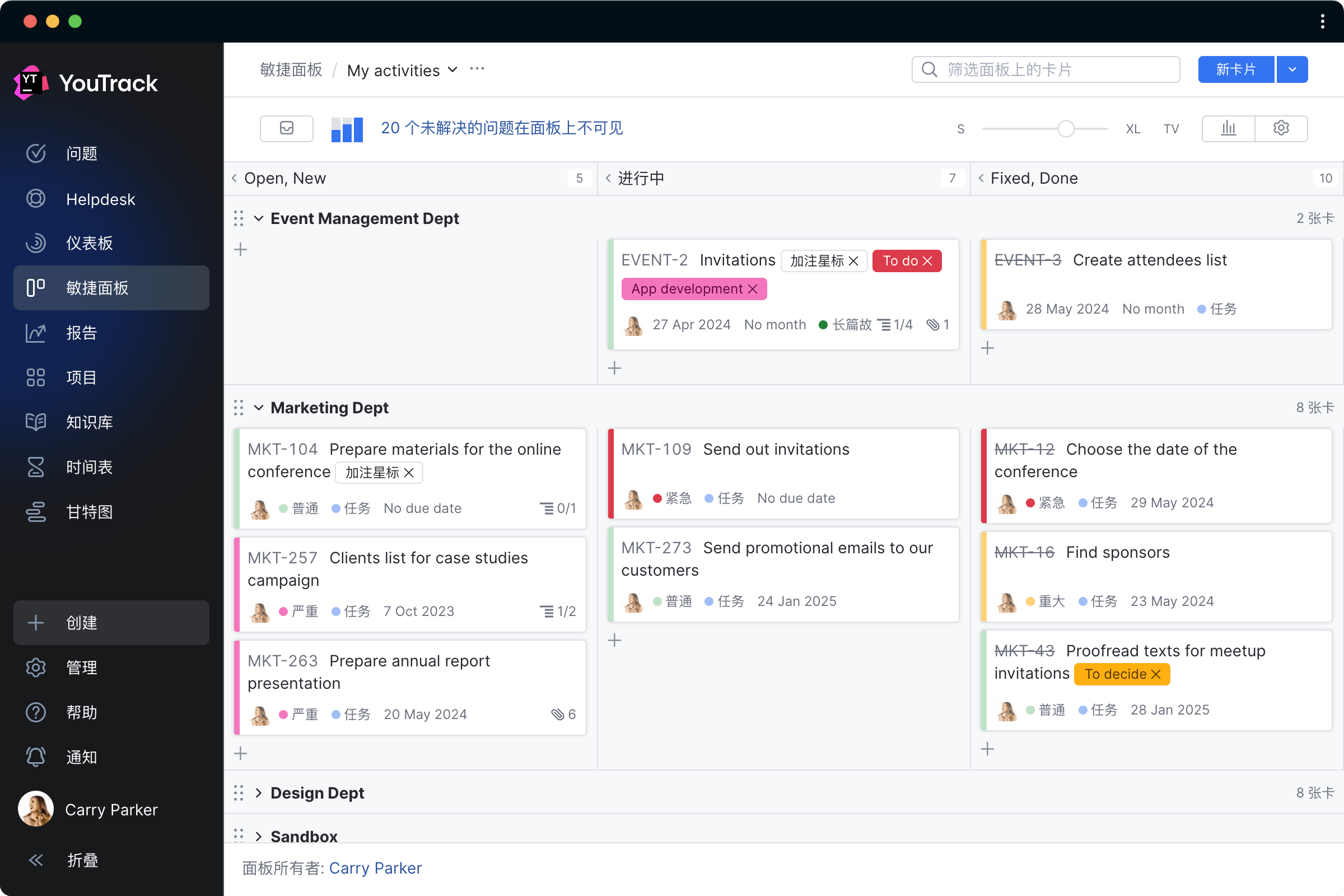 敏捷面板是所有敏捷项目管理系统的基石。 YouTrack 提供了 Scrum 和看板面板预设,也允许您自由创建与团队现有流程相匹配的面板。