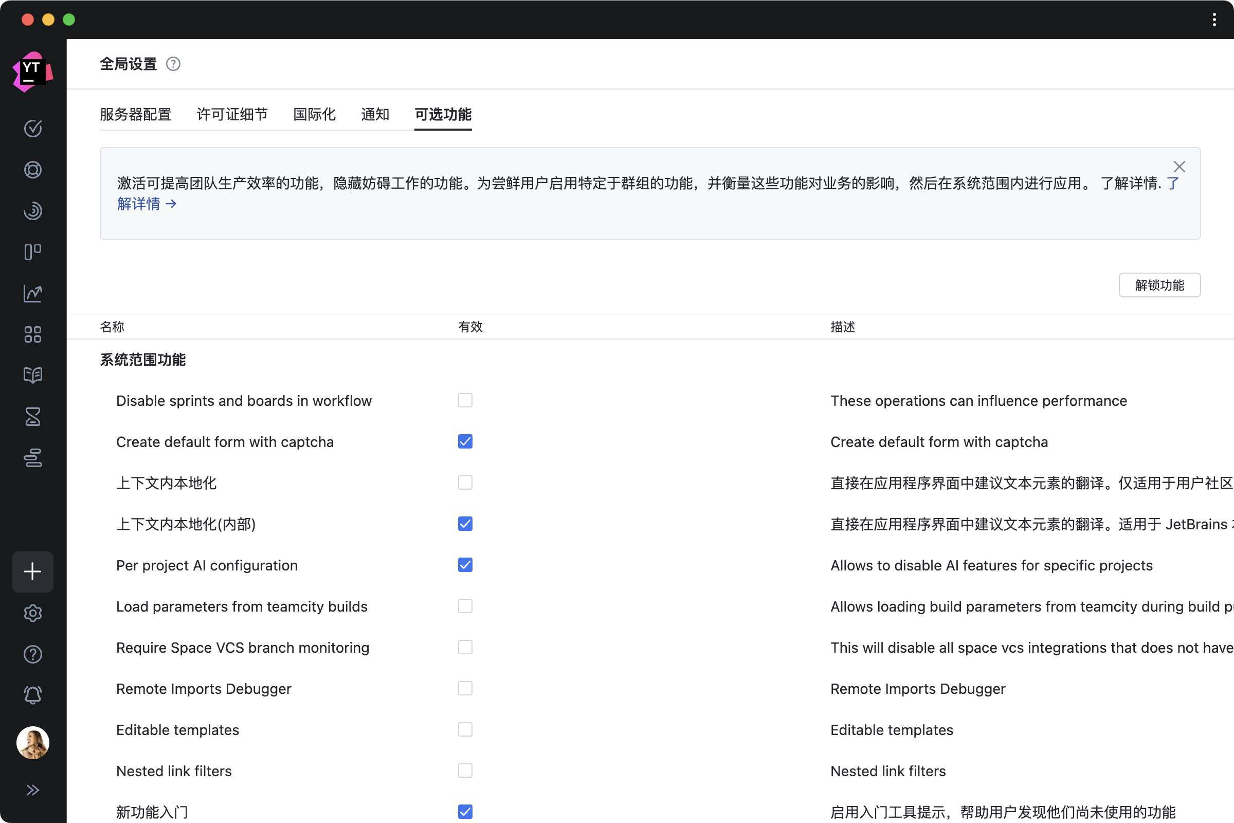 启用 YouTrack 中的实验性功能,预览尚未正式发布的新功能。 这可以让您抢先尝试新功能,并根据您的需求指引开发方向。