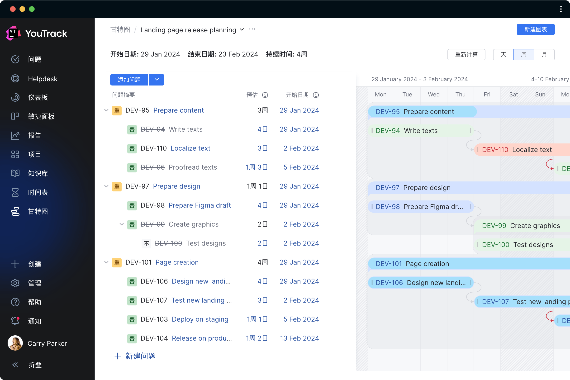 YouTrack 具有多种功能,可以帮助您规划冲刺、确定任务优先级、跟踪依赖项以及做出切合实际且可实现的预估。