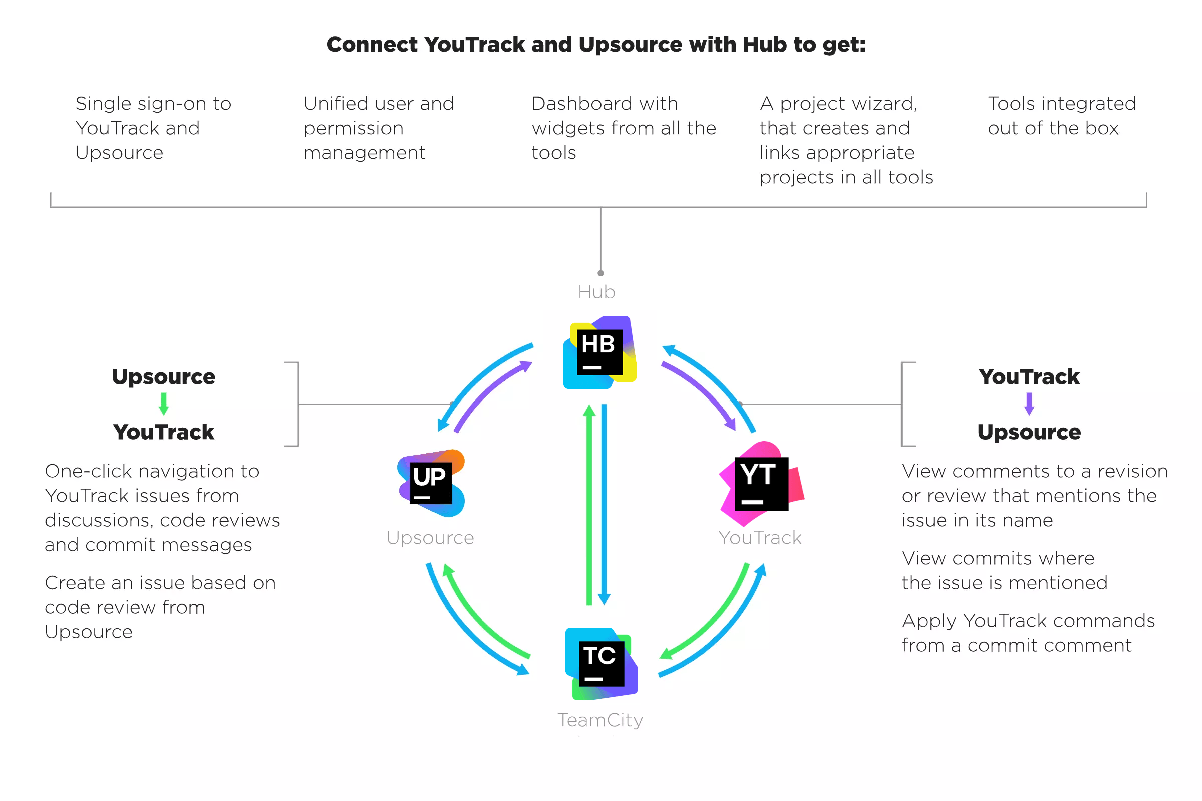 YouTrack 与其他 JetBrains 产品和大量第三方系统集成,可以简化开发、测试、支持和其他流程。