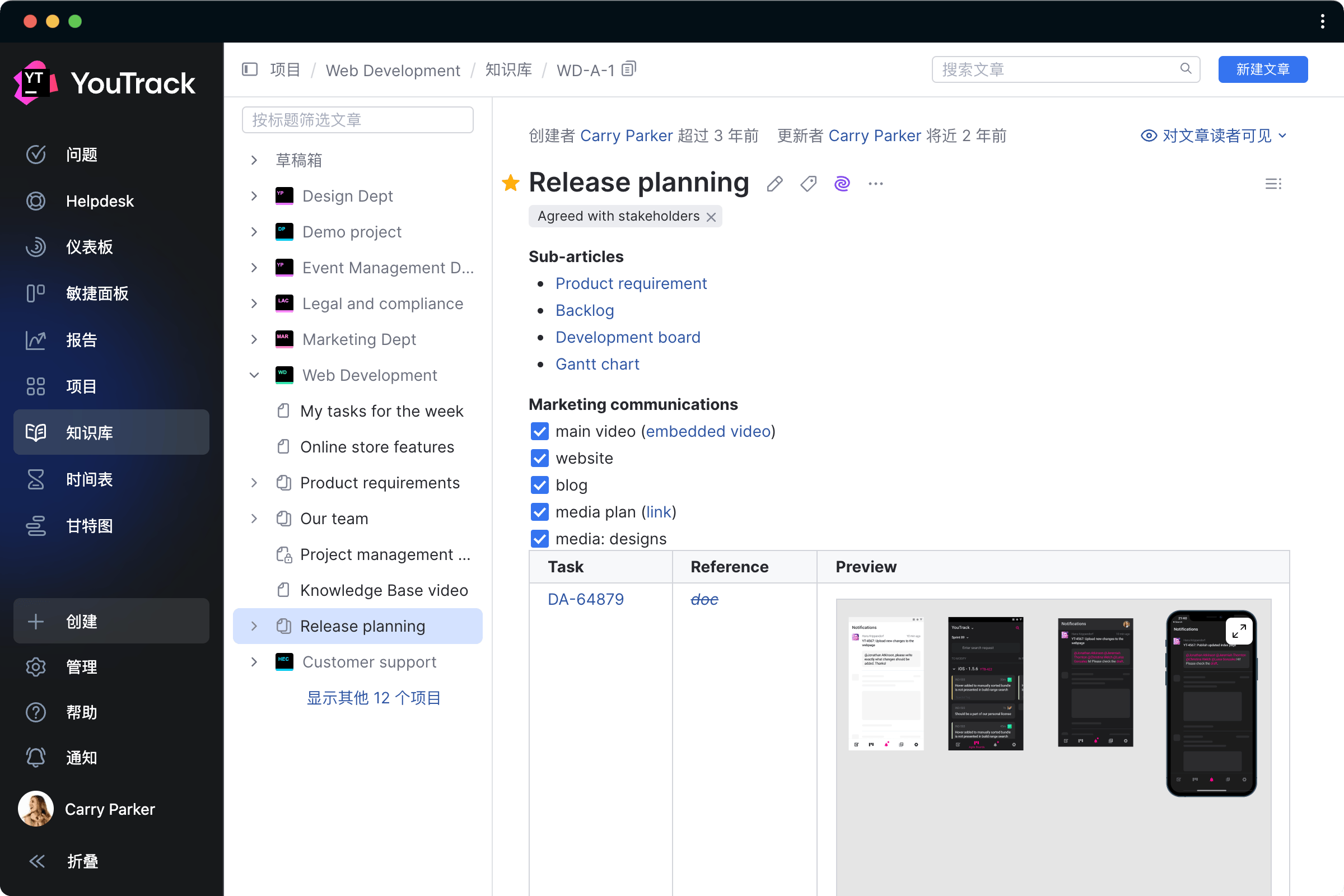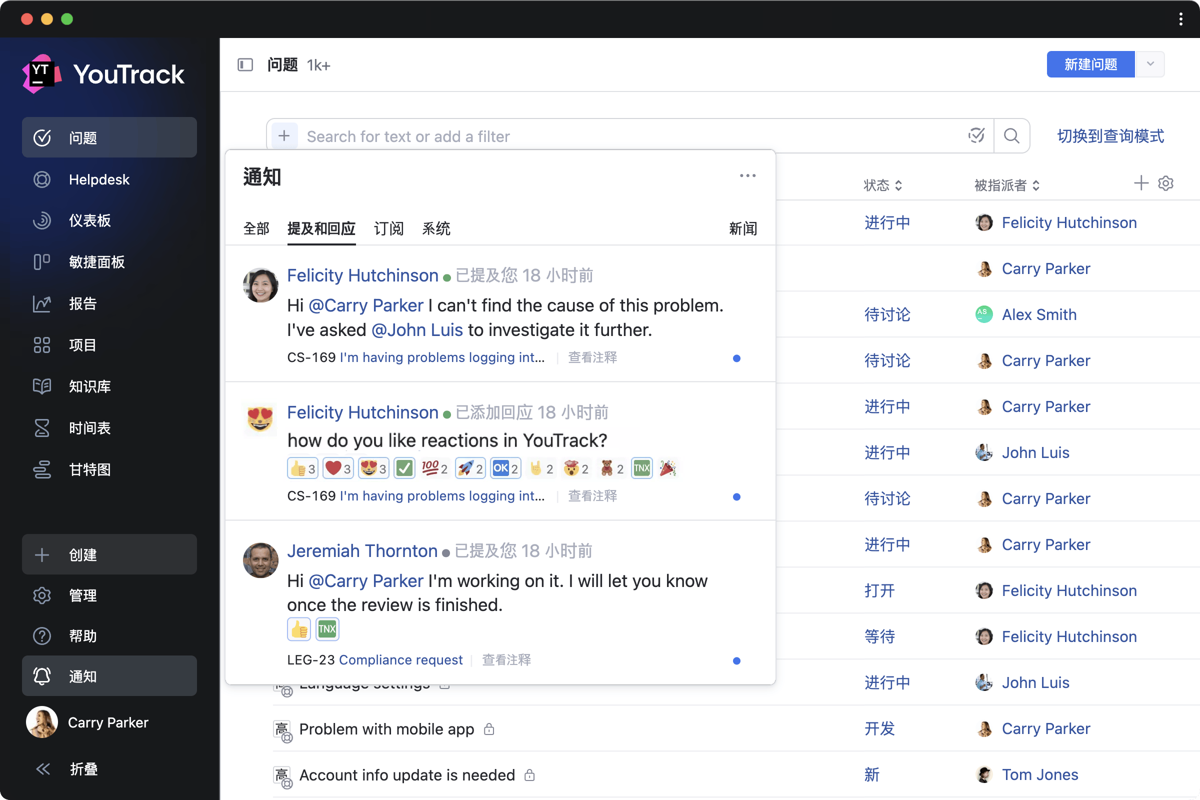 YouTrack 包含多种功能,可在团队内部和团队之间实现直观轻松的协作。 提及、回应和自动更新订阅以及多种通知选项有助于保持沟通流畅和确保消息及时送达。