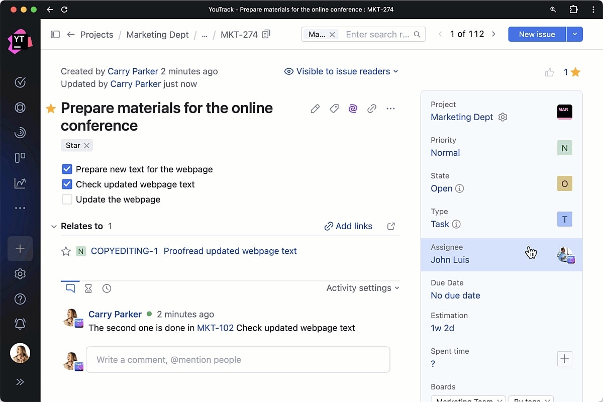 YouTrack 的高级编辑器可以轻松创建丰富且有意义的问题描述。 内联图片和表格、问题链接、自动重复问题检测以及许多其他功能可以帮助您清晰有效地定义任务。 编辑器会随着您的键入自动保存草稿,确保您的绝妙想法不会丢失。