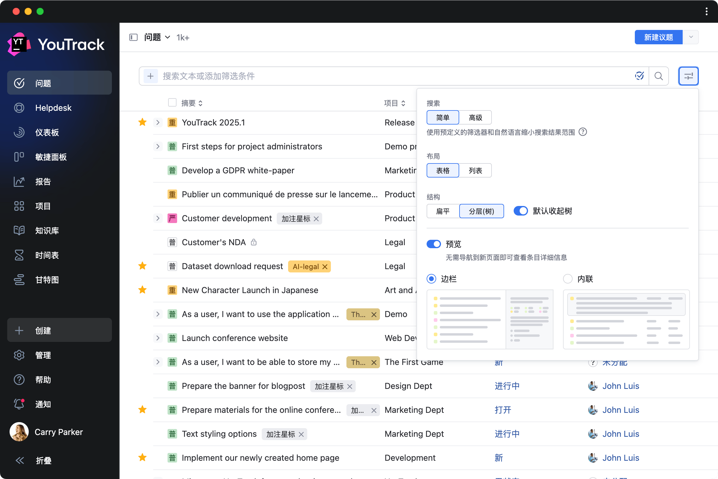 在组织工作空间和任务视图时,您有很多选项可供选择。 您可以在列表和表视图之间轻松切换,并根据需要自定义详细信息。 许多字段可以直接在问题视图中编辑,以节省您的时间和精力,快速预览有助于减少上下文切换。 按多个字段排序和分组可以轻松管理大型任务列表。