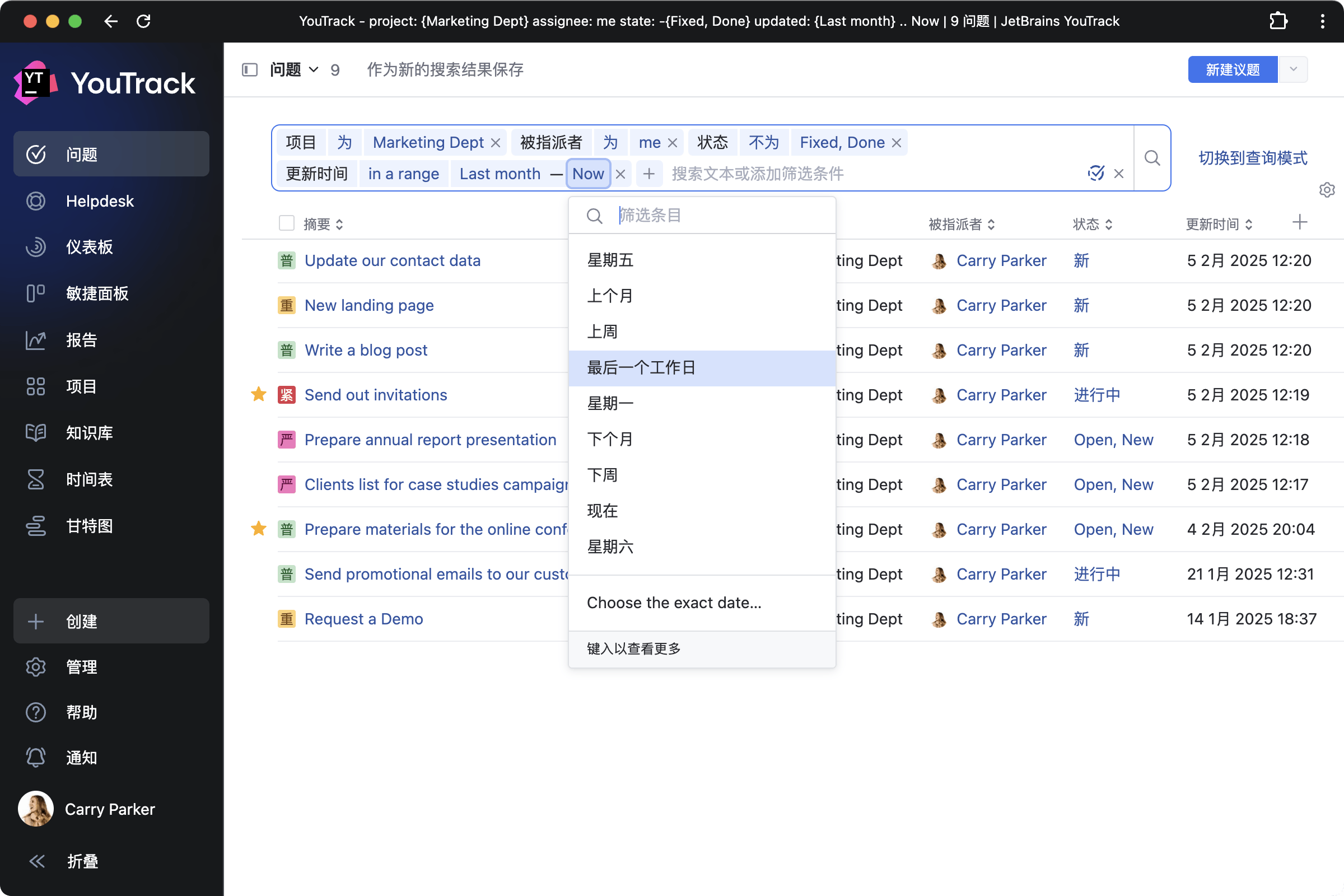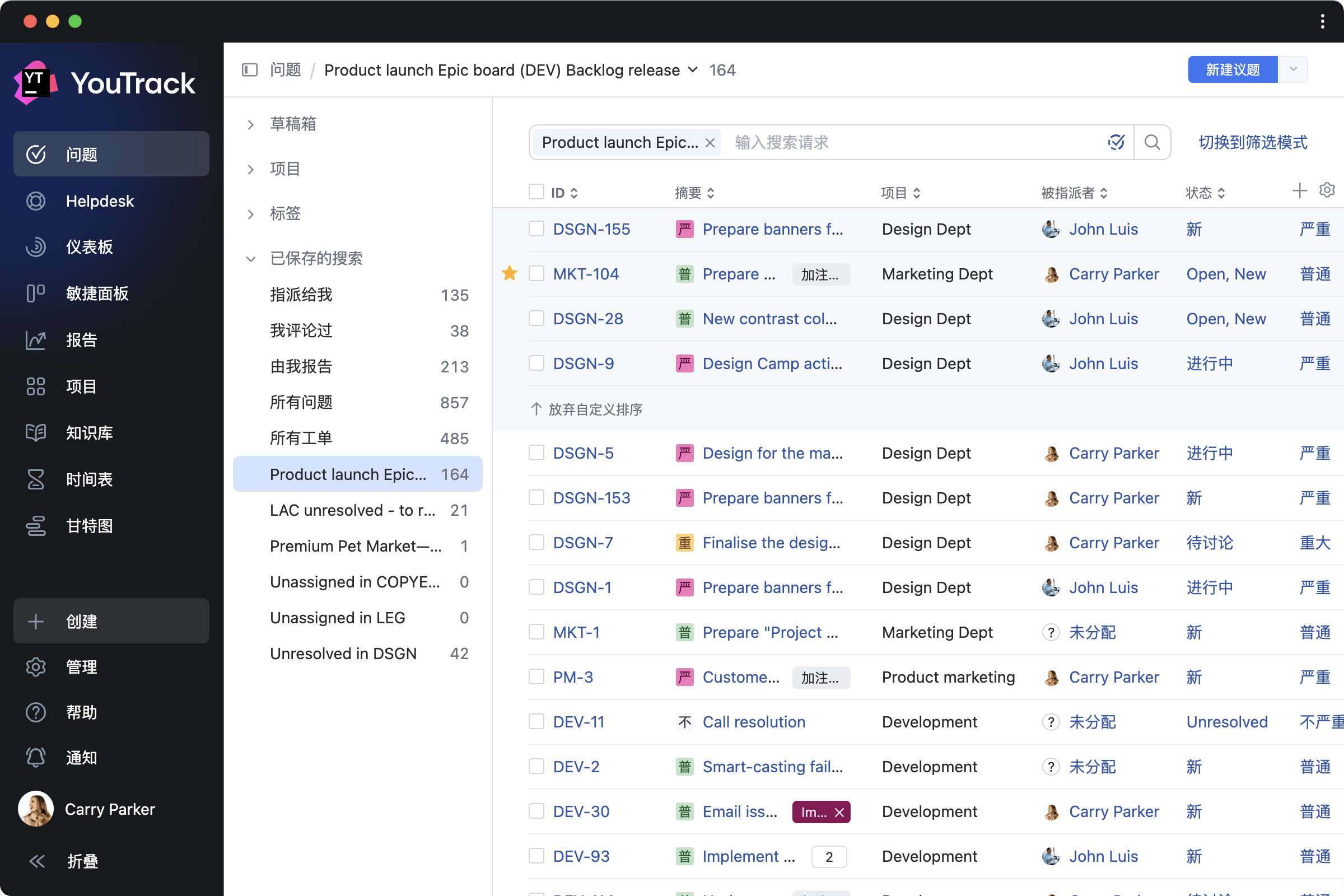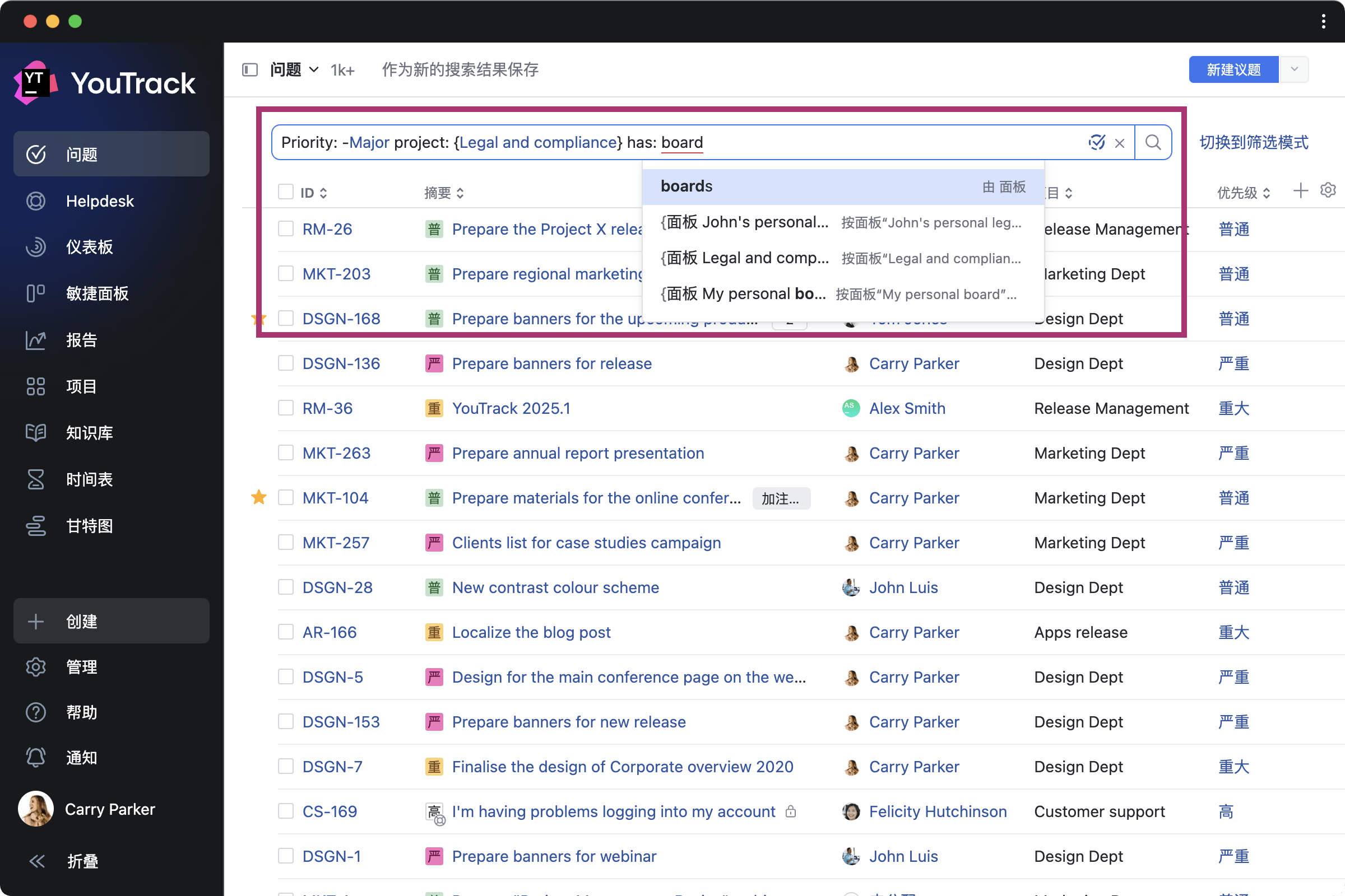 可共享的直观筛选器和高级查询语言搜索选项可以确保您和团队始终清楚地关注需要跟踪的任务。 您可以轻松搜索文本或使用建议可能搜索值的动态筛选器,也可以使用查询模式创建复杂的搜索请求。 然后,您可以保存搜索以供随时查看,也可以与团队共享,让每个人都能了解最新进展。