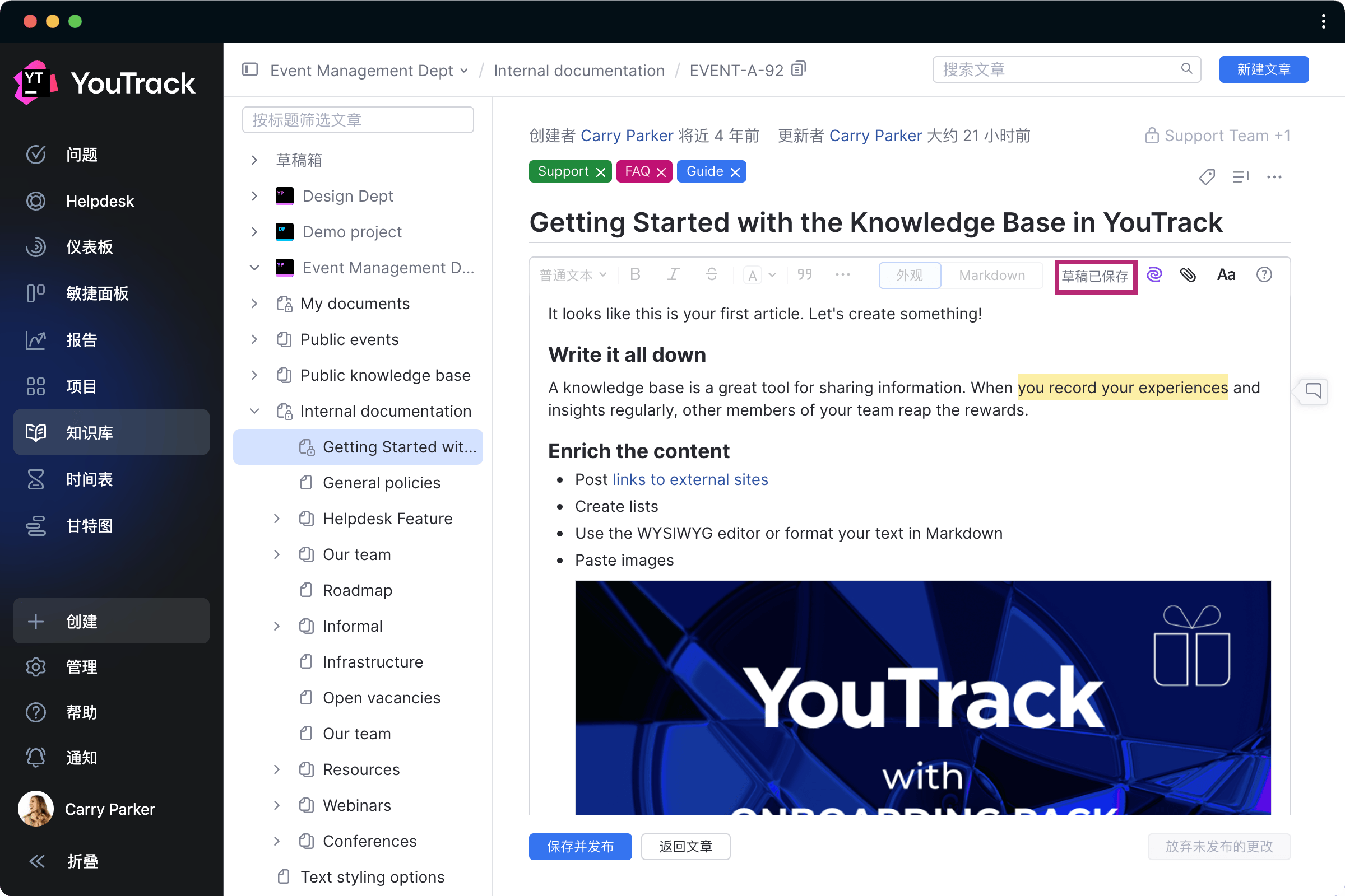 知识库会在您工作时存储草稿,并为您创建的每篇文章保留修订历史,确保您的绝妙想法永远不会丢失。