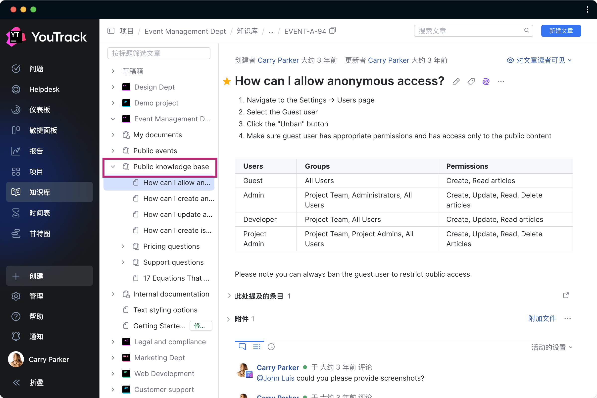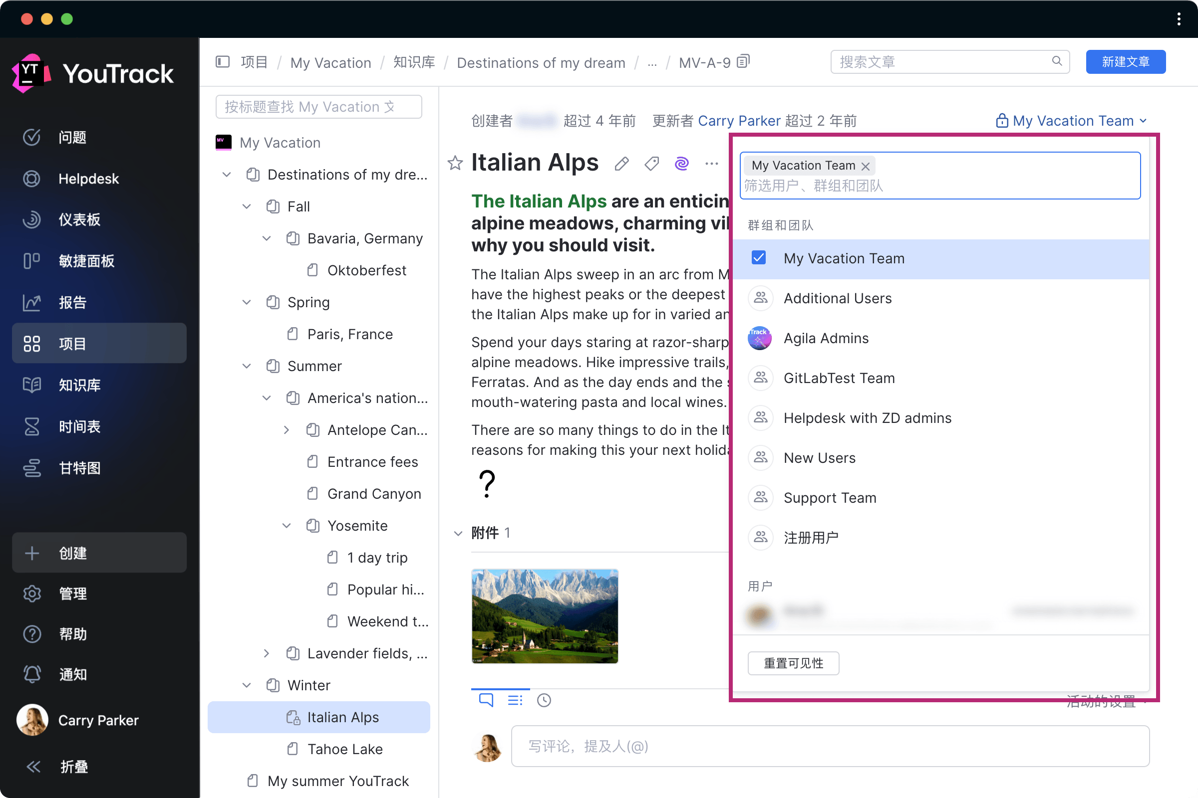 创建、编辑和查看文章的权限设置遵循的原则与 YouTrack 问题中使用的原则完全相同,因此 YouTrack 管理员可以快速上手。 知识库中的每篇文章都有自己的可见性设置,清楚地表明谁有权阅读。