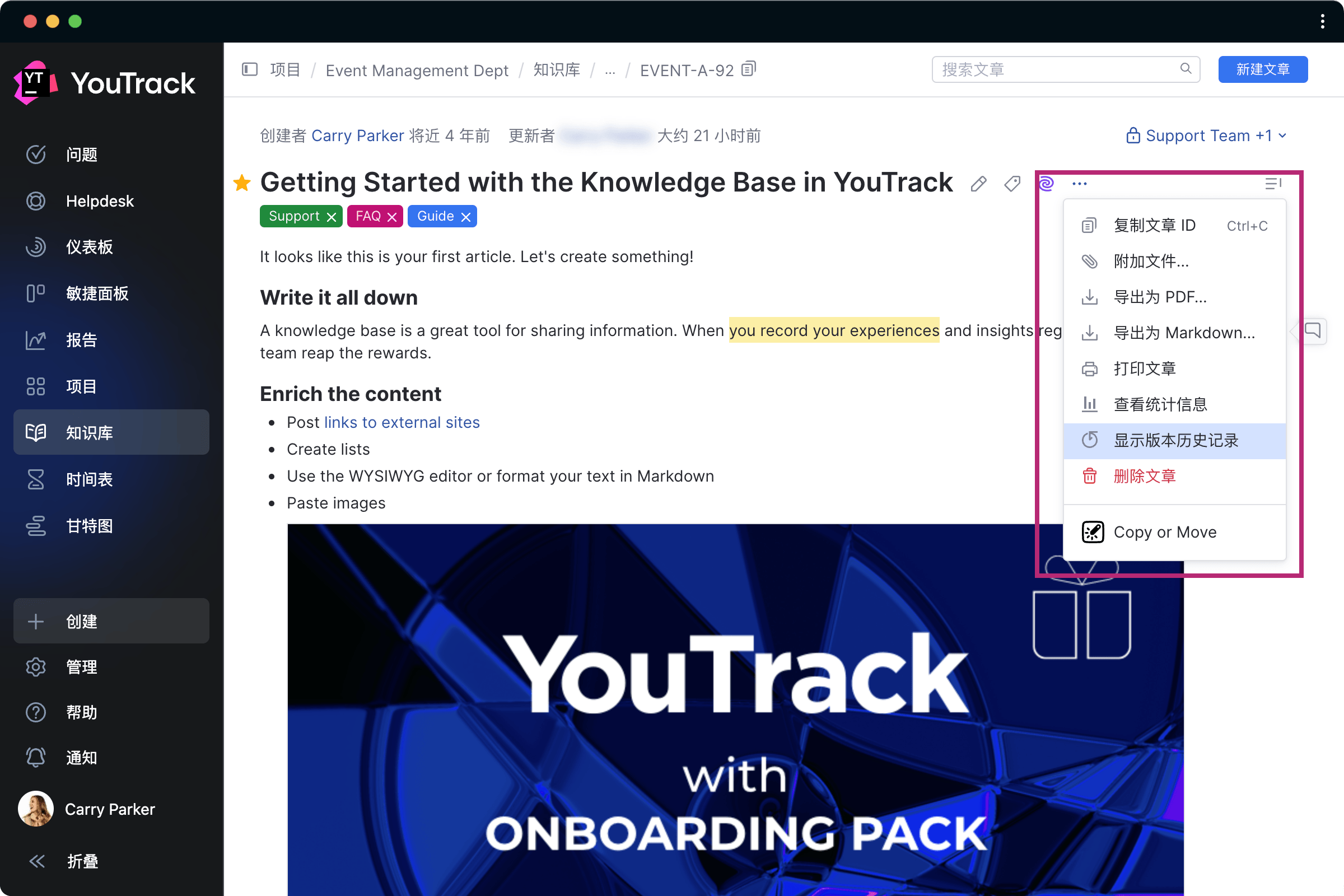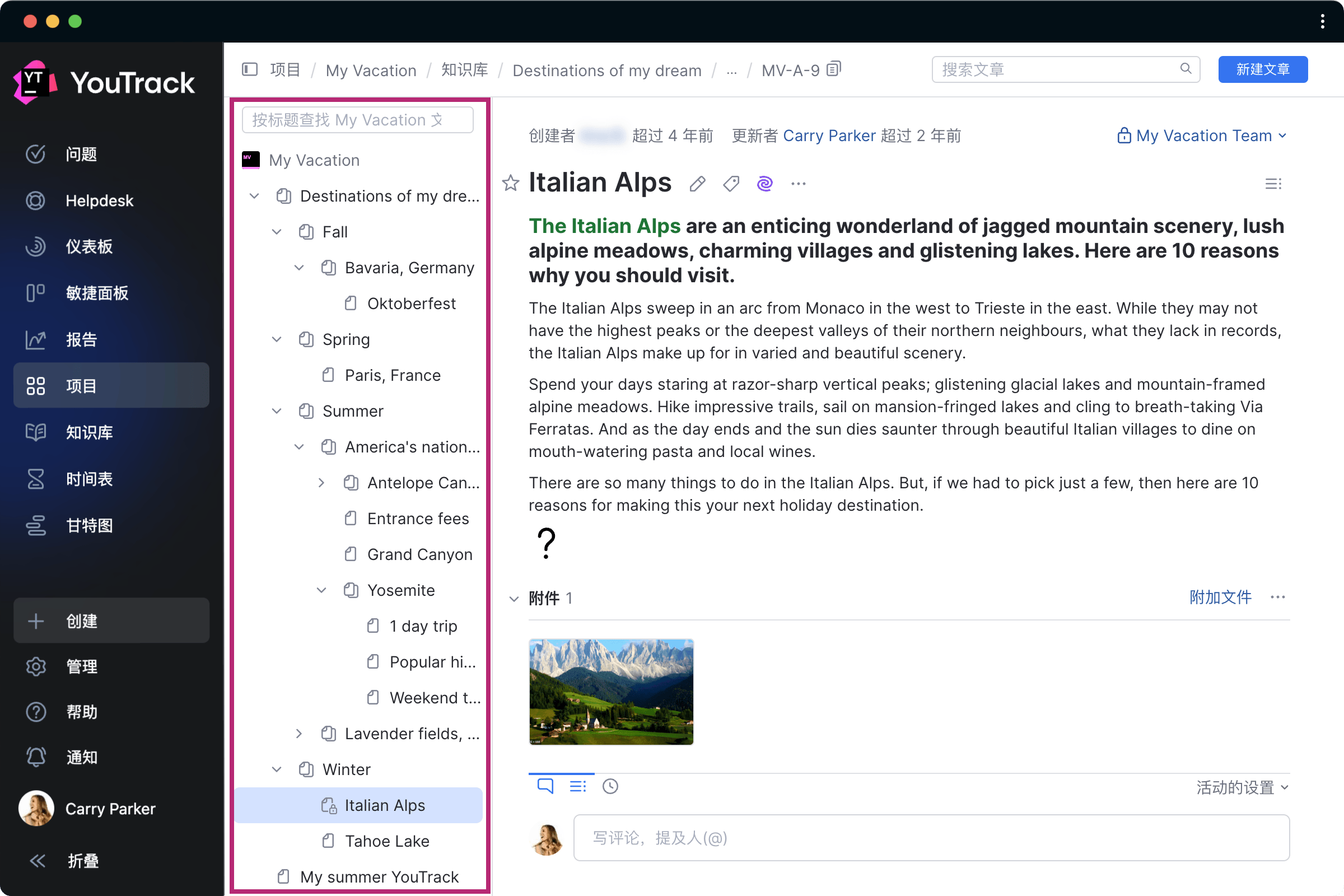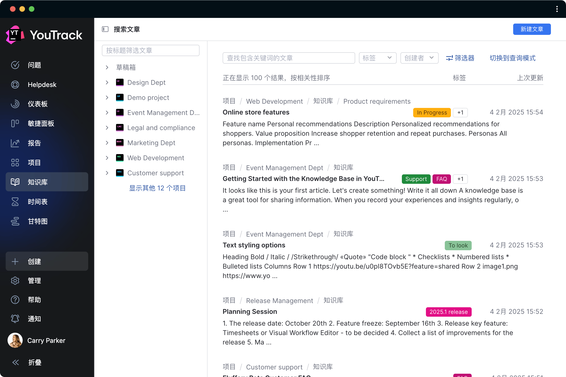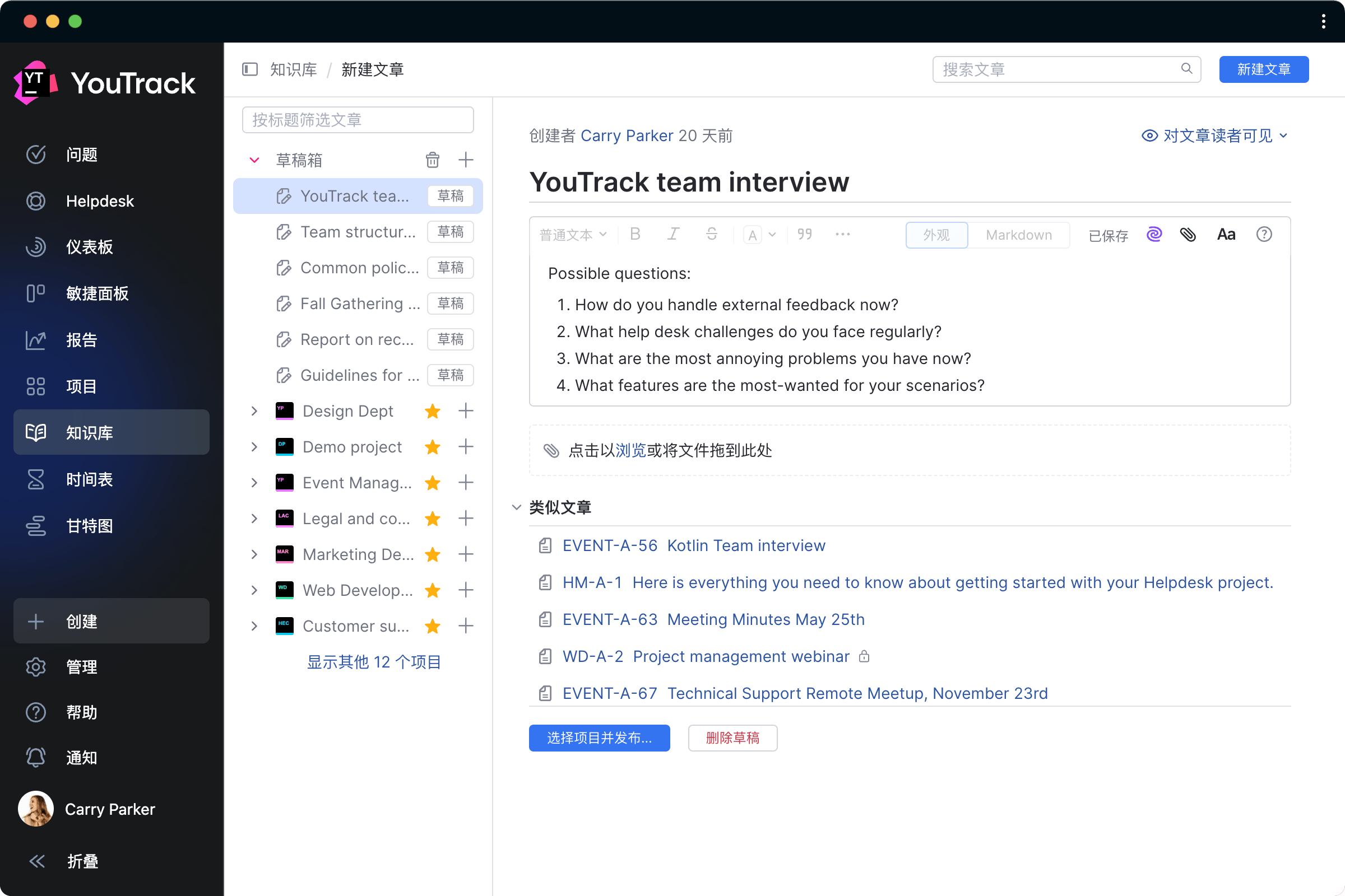 YouTrack 的知识库让您可以创建具有无限嵌套层次结构的文章树,以合乎逻辑的方式排列和整理大量信息。 将文章及其子文章拖放到内容菜单中即可重新排列文章。
